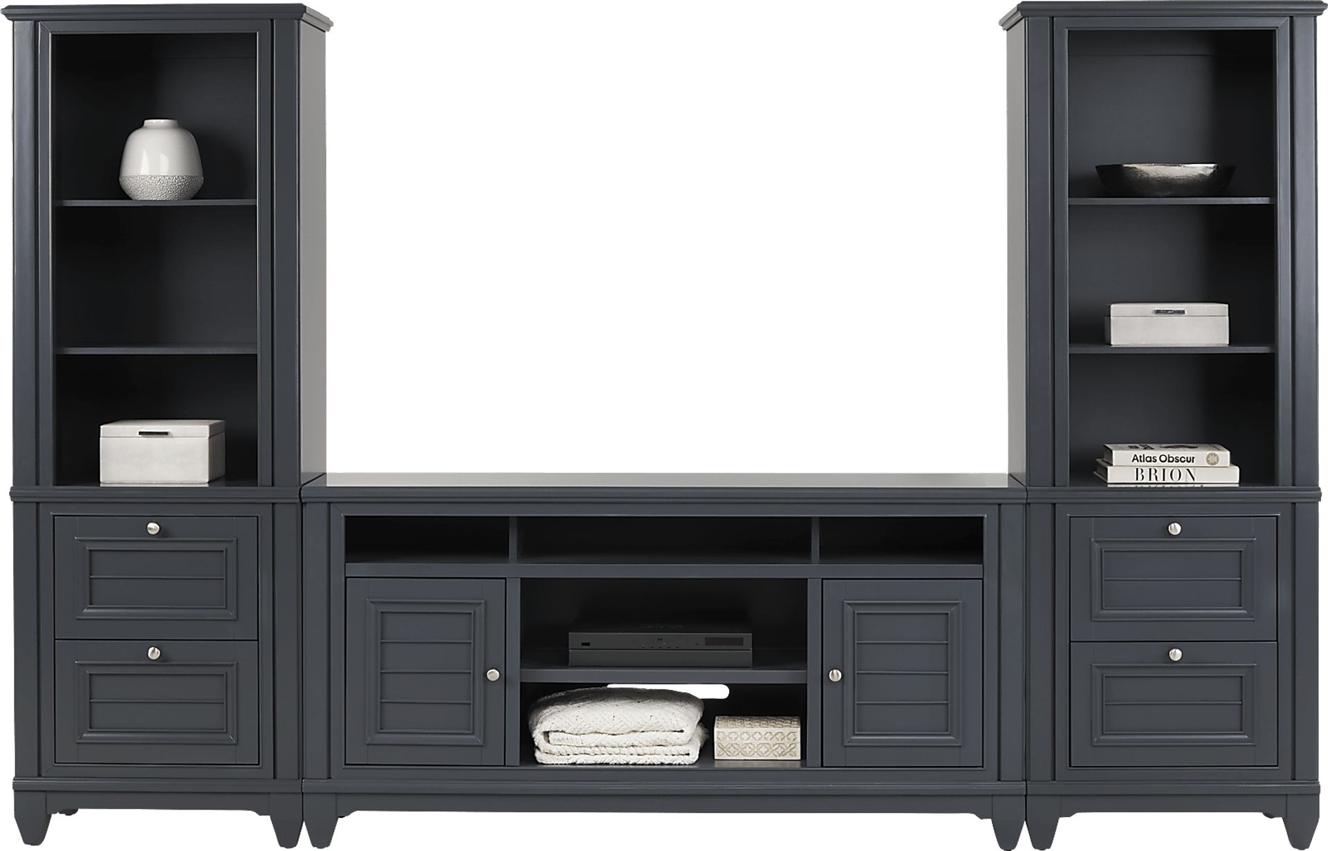 Center your home entertainment space with the coastal style of the Hilton Head wall unit. This piece is perfect for your TV, sound system and any additional media devices you want to keep organized. This unit comes in a beautiful graphite color and features five storage cubbies great for cable boxes or Blu-ray players along with two cabinets to keep additional cables or discs safely tucked away. A storage pier at each end provides two additional drawers per side as well as three shelves ideal for books, family photos and more!