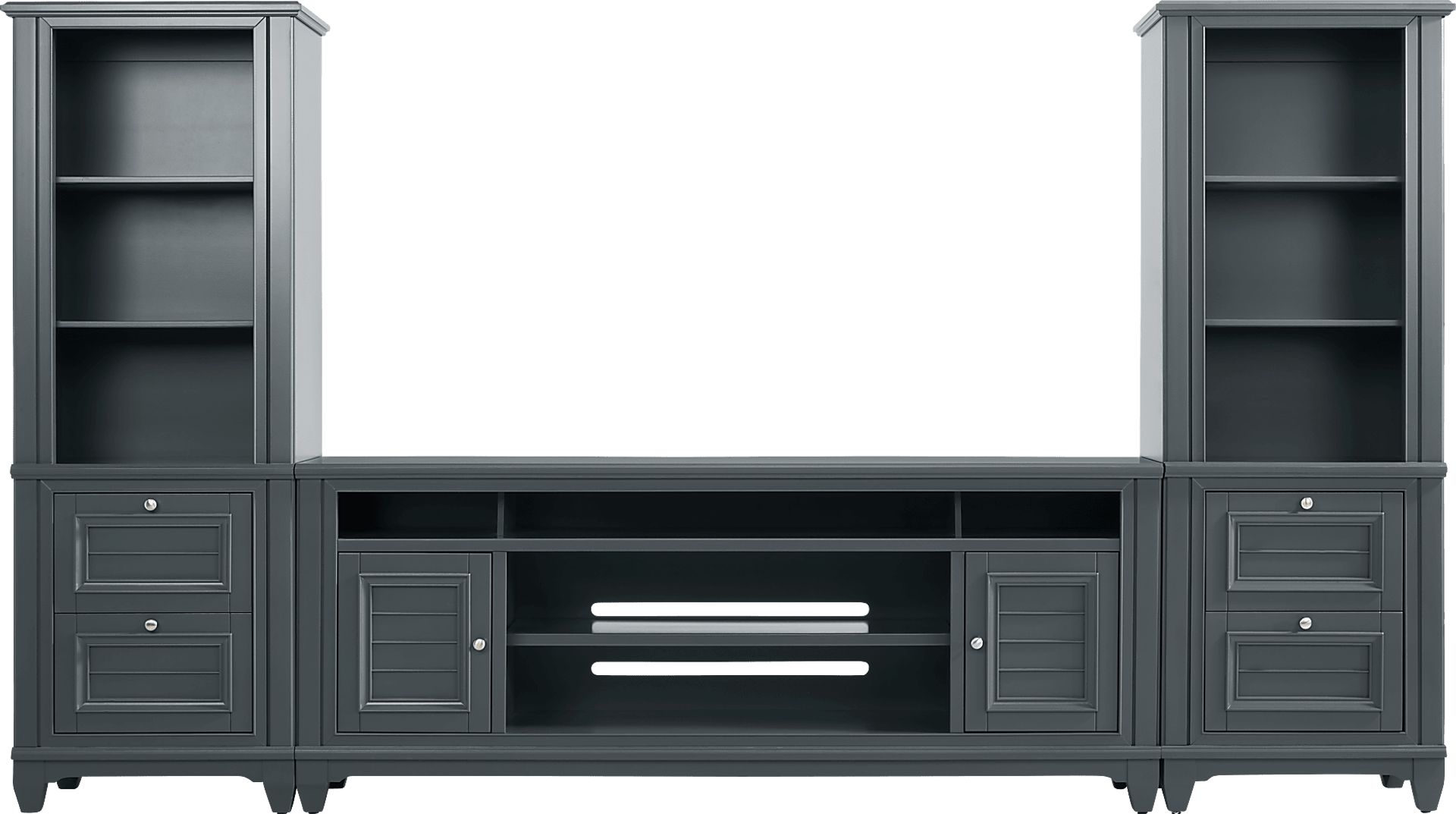 Stylish and casual, the Hilton Head collection is perfect for your TV, sound system and any additional media devices you want to keep organized. Contemporary in style, this wall unit comes in a beautiful graphite finish and showcases slat styled doors and drawers with silver metal knobs. Its 82-inch console features five open shelves and two cabinets that's great for storing your entertainment essentials. A storage pier at each end provides two additional drawers per side as well as three shelves ideal for books, family photos and more.