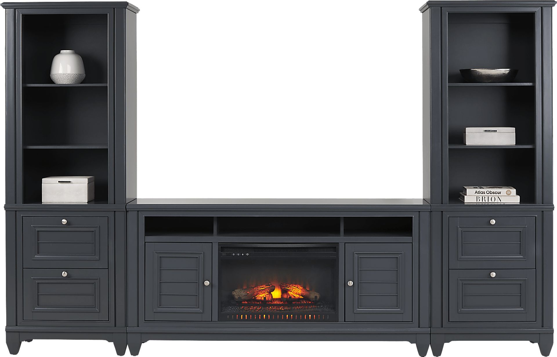 Center your home entertainment space with the coastal style of the Hilton Head wall unit. This piece is perfect for your TV, sound system and any additional media devices you want to keep organized. This unit comes in a beautiful graphite color and features three storage cubbies great for cable boxes or Blu-ray players along with two cabinets to keep additional cables or discs safely tucked away. A storage pier at each end provides two additional drawers per side as well as three shelves ideal for books, family photos and more. The included electric fireplace features innovative flame effects on bricks and logs for added depth and 3D realism. A convenient remote control allows you to adjust the flame and glow levels.