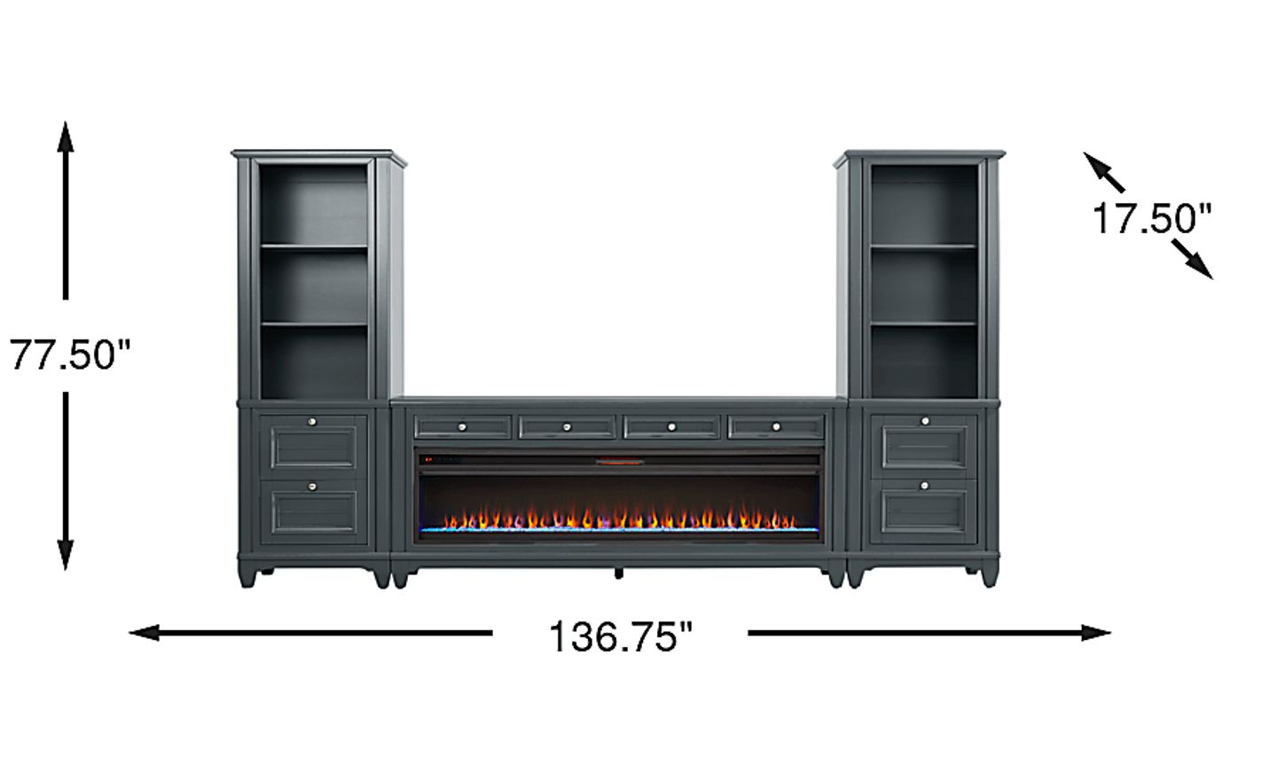 This unit is a substantial furniture statement, measuring approximately 11.4 feet wide (136.75"). It is best suited for large, expansive walls commonly found in suburban family rooms or open-concept living areas. At over 6 feet tall (77.5"), it provides a commanding presence that mimics the look of high-end custom built-ins without the need for permanent structural modifications.