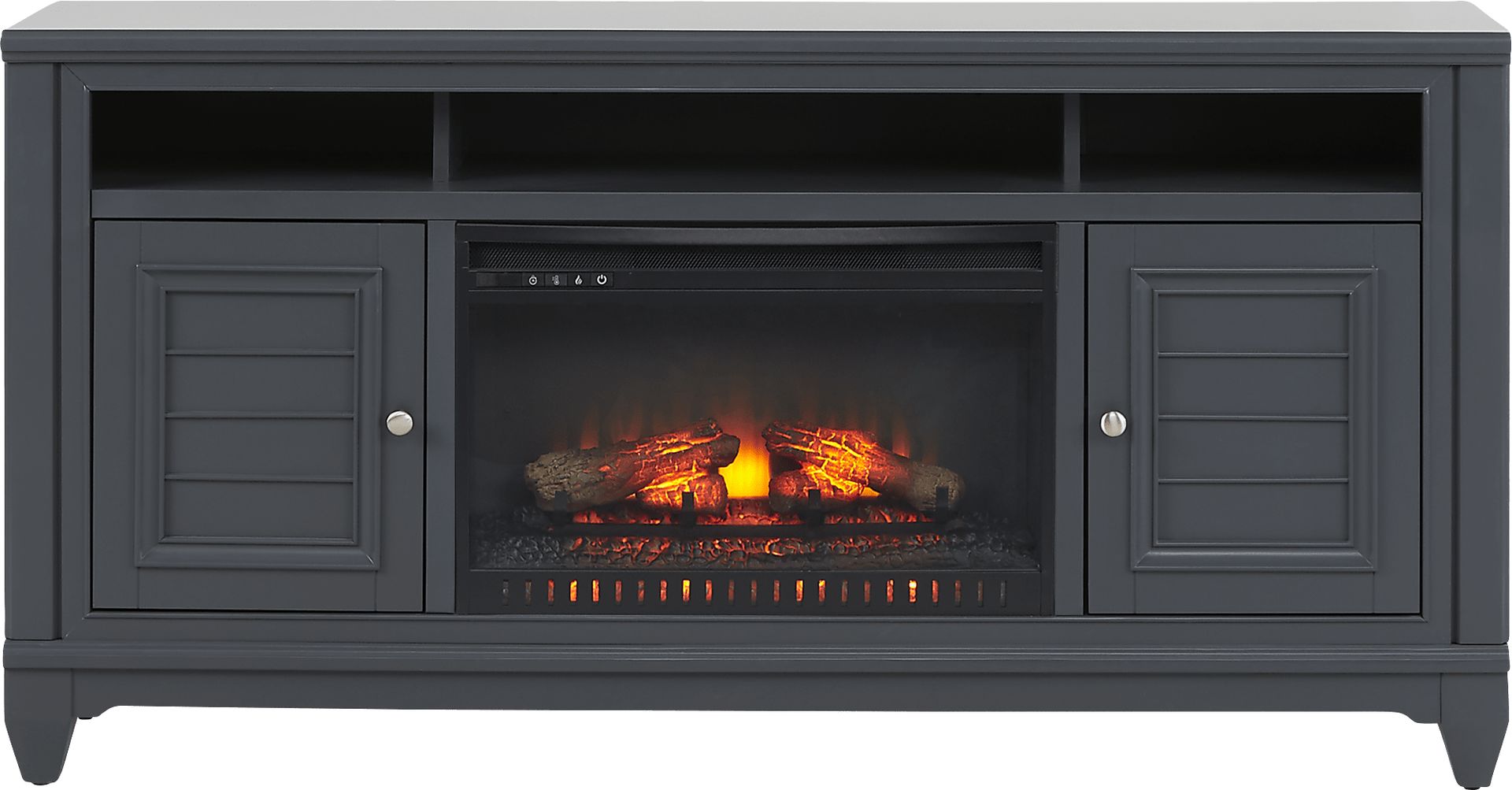 Center your home entertainment space with the coastal style of the Hilton Head console. This piece is perfect for your TV, sound system and any additional media devices you want to keep organized. This console comes in a beautiful graphite color and features three storage cubbies that are great for cable boxes or Blu-ray players along with two cabinets to keep additional cables or discs safely tucked away. The included electric fireplace features innovative flame effects on bricks and logs for added depth and 3D realism. A convenient remote control allows you to adjust the flame and glow levels.