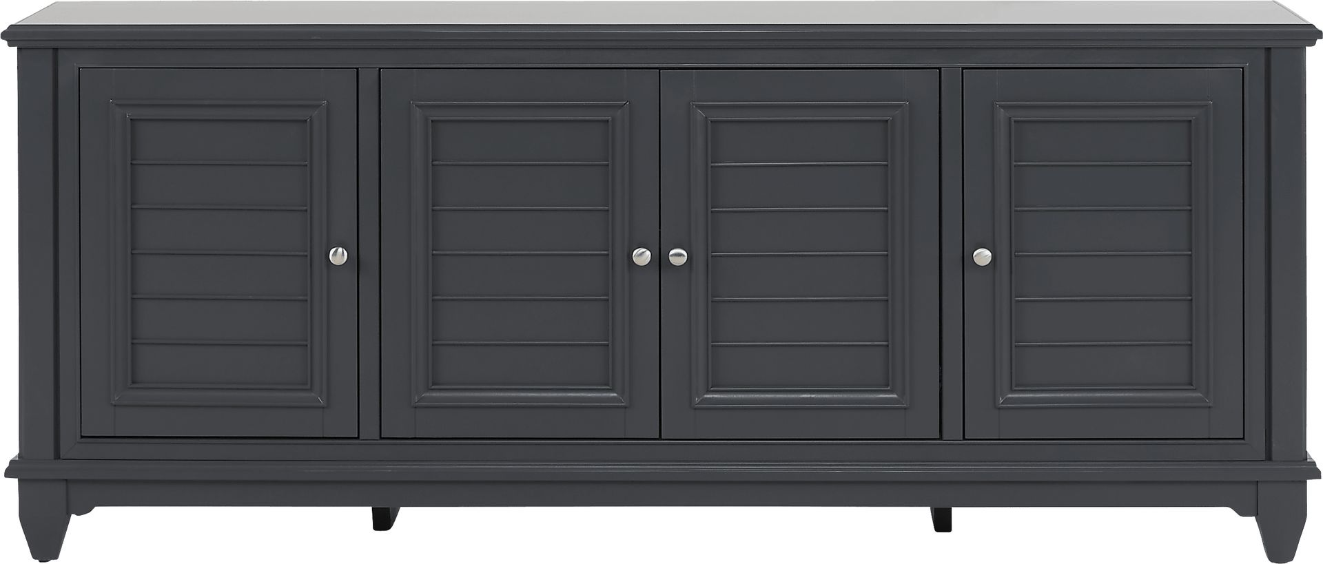 Stylish and casual, the Hilton Head credenza offers elegant, reliable storage and display space. With a contemporary style, this piece showcases a beautiful graphite finish and simplistic silhouette. Its 4 slat-styled doors reveal spacious shelving that's great for keeping your home essentials stored and out of site. Silver metal knobs are adorned on each door for a stylish final touch.