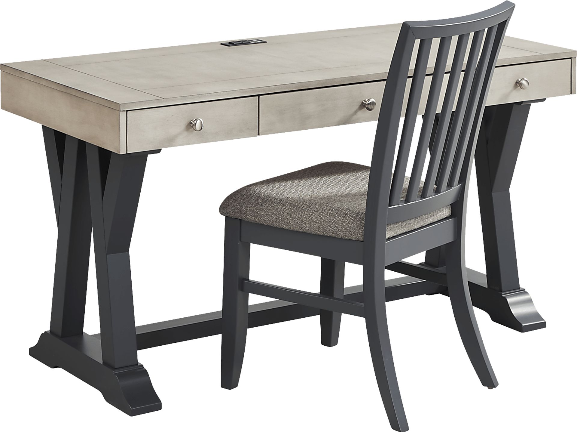 With refreshing hues and airy silhouettes with the laidback vibes of a beachside retreat, the Hilton Head desk and chair brightens your space with its clean lines and soothing ambiance. Contemporary in style, this sleek collection is crafted with birch veneers. The desktop is finished in a soft gray and features three drawers to store your office essentials while two electrical outlets with two USB ports bring convenient charging to your devices. The contrasting graphite trestle base adds a unique appearance with an intricate crossed design. The coordinating chair includes a comfortable seat cushion upholstered in gray fabric and showcases a classic slat back design for a final touch.