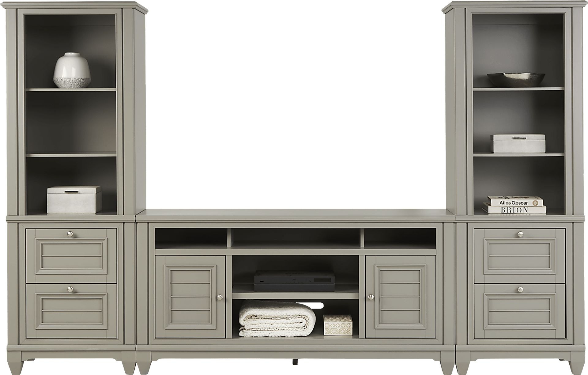 To preserve the beautiful gray finish of your wall unit, our care guide recommends regular dusting with a soft, dry cloth. For more stubborn spots, use a cloth lightly dampened with mild soap and water, then dry the surface immediately. You should avoid using harsh chemical cleaners or abrasive pads, as these can damage the protective topcoat and dull the silver-finished hardware over time.