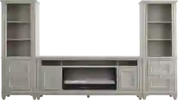 This 4-piece configuration is built for high-capacity organization, offering a total of four drawers and six shelves. The central 82-inch console features three open storage cubbies for easy access to soundbars or media players, along with two cabinets featuring contemporary slat-styled doors. The storage piers at each end provide two additional drawers per side and three shelves each, which are ideal for displaying family photos or storing a large book collection.
