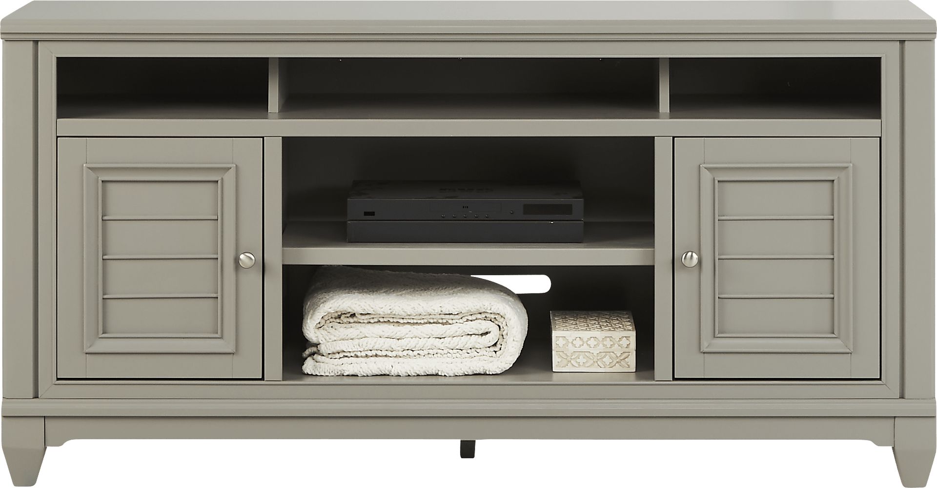 Center your home entertainment space with the coastal style of the Hilton Head console. This piece is perfect for your TV, sound system and any additional media devices you want to keep organized. This console comes in a beautiful gray color and features five storage cubbies great for cable boxes or Blu-ray players along with two cabinets to keep additional cables or discs safely tucked away.