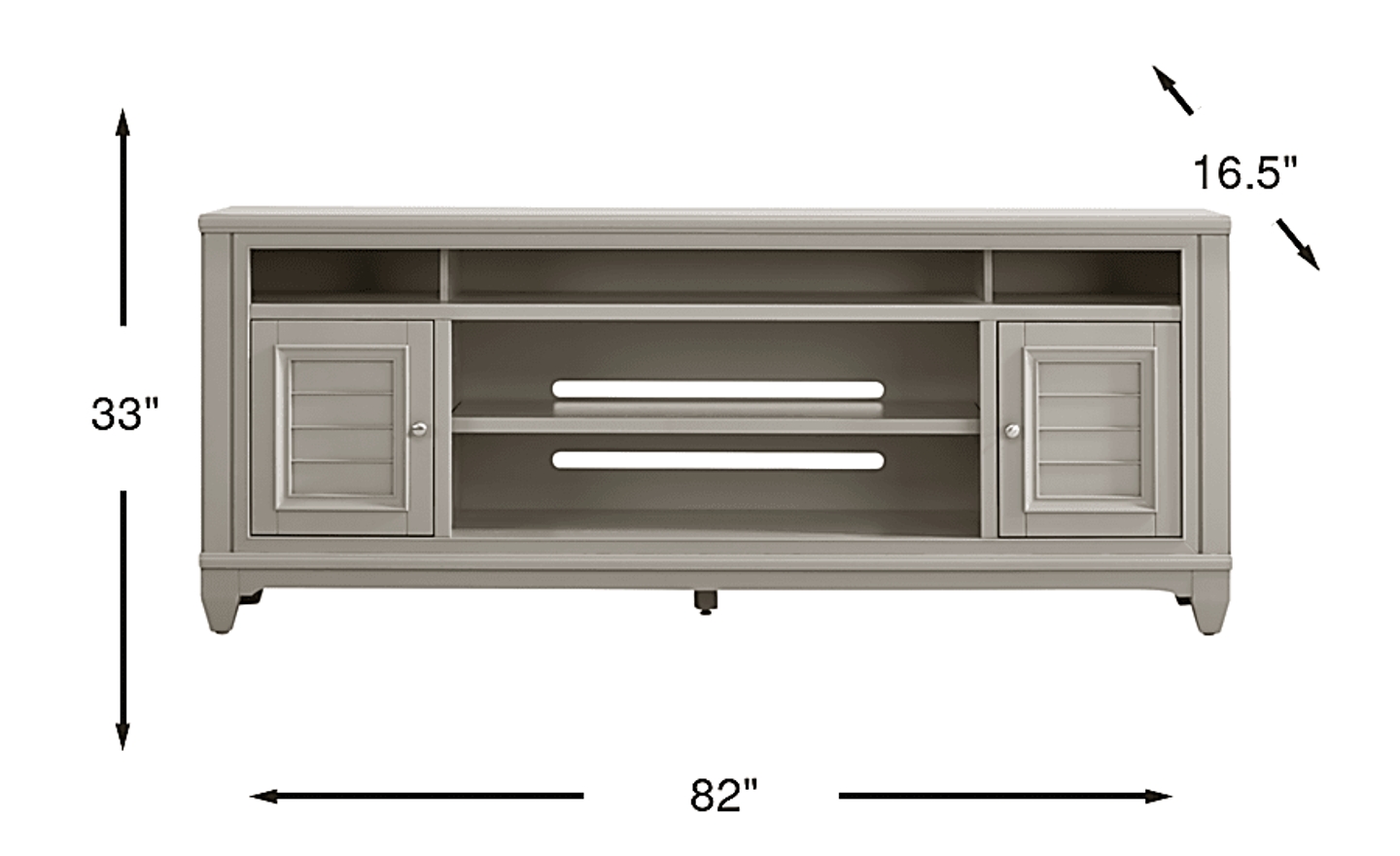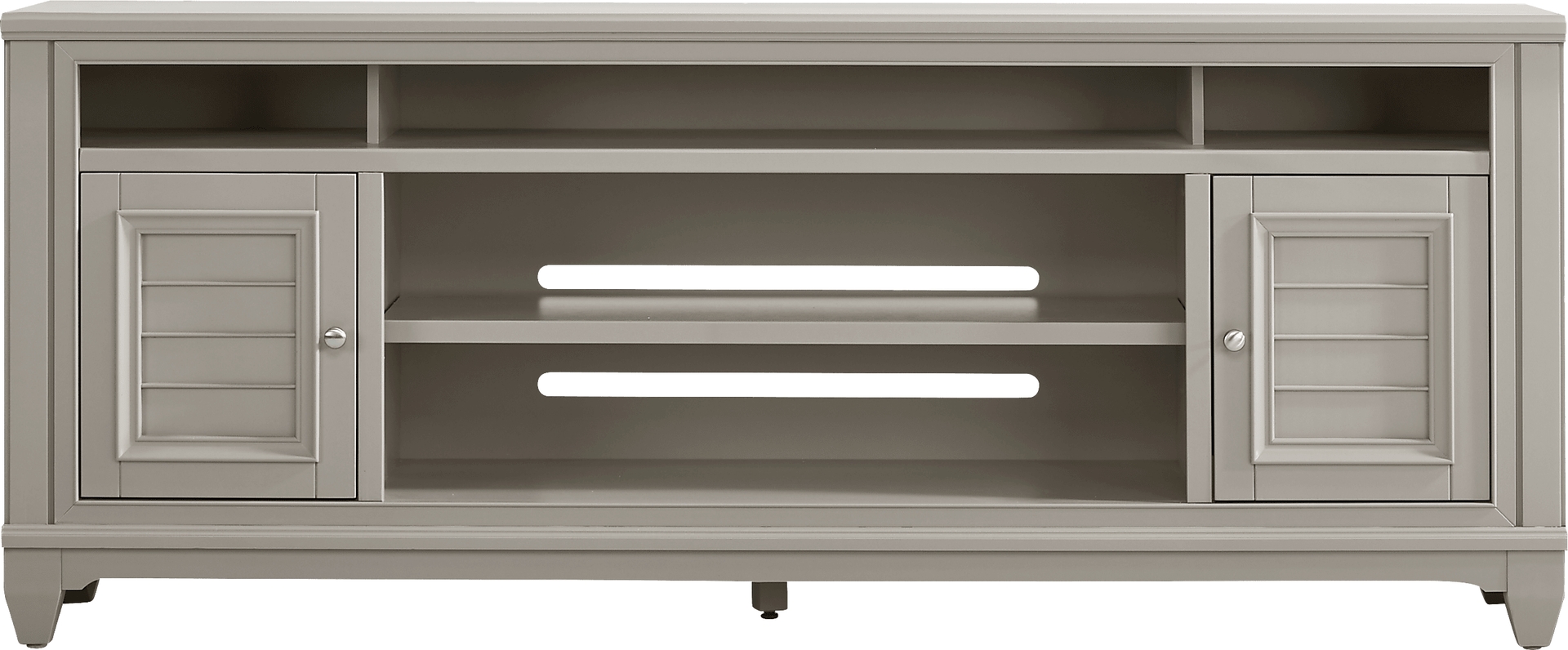 Stylish and casual, the Hilton Head collection is perfect for your TV, sound system and any additional media devices you want to keep organized. Contemporary in style, this console comes in a beautiful gray finish and showcases two slat styled doors that provide hidden storage for all your entertainment essentials. Three top cubbies offer space for smaller decor while two open shelves at the center offer a clutter-free set up with wire management holes in the back. Silver knobs complete the look with a refined touch.