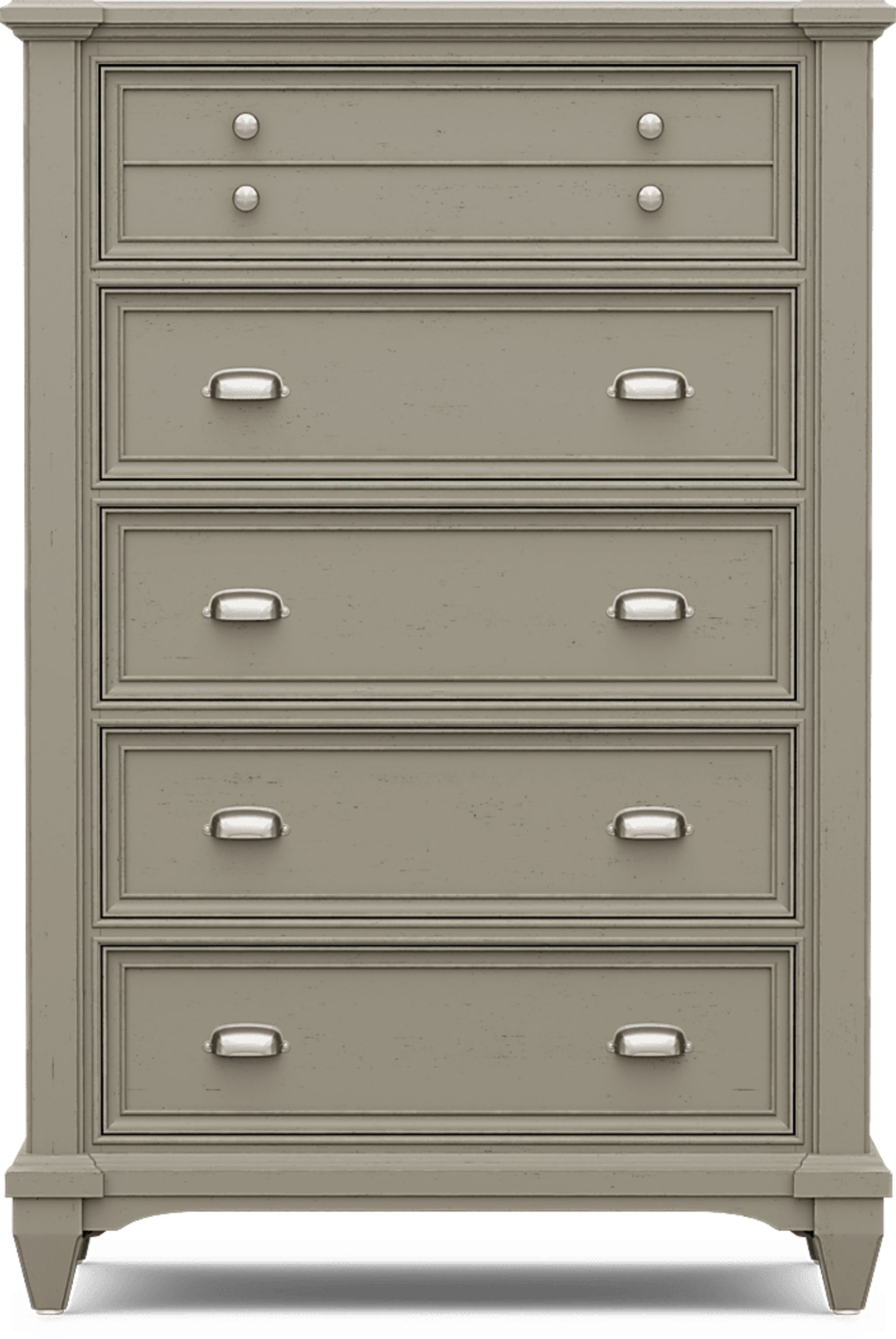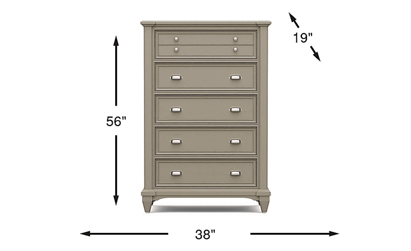 Classic cottage styling and a lovely gray finish make the Hilton Head chest an eye pleasing and practical addition to your bedroom. Five drawers are crafted with strong English and French dovetail construction and completed with brushed nickel hardware.