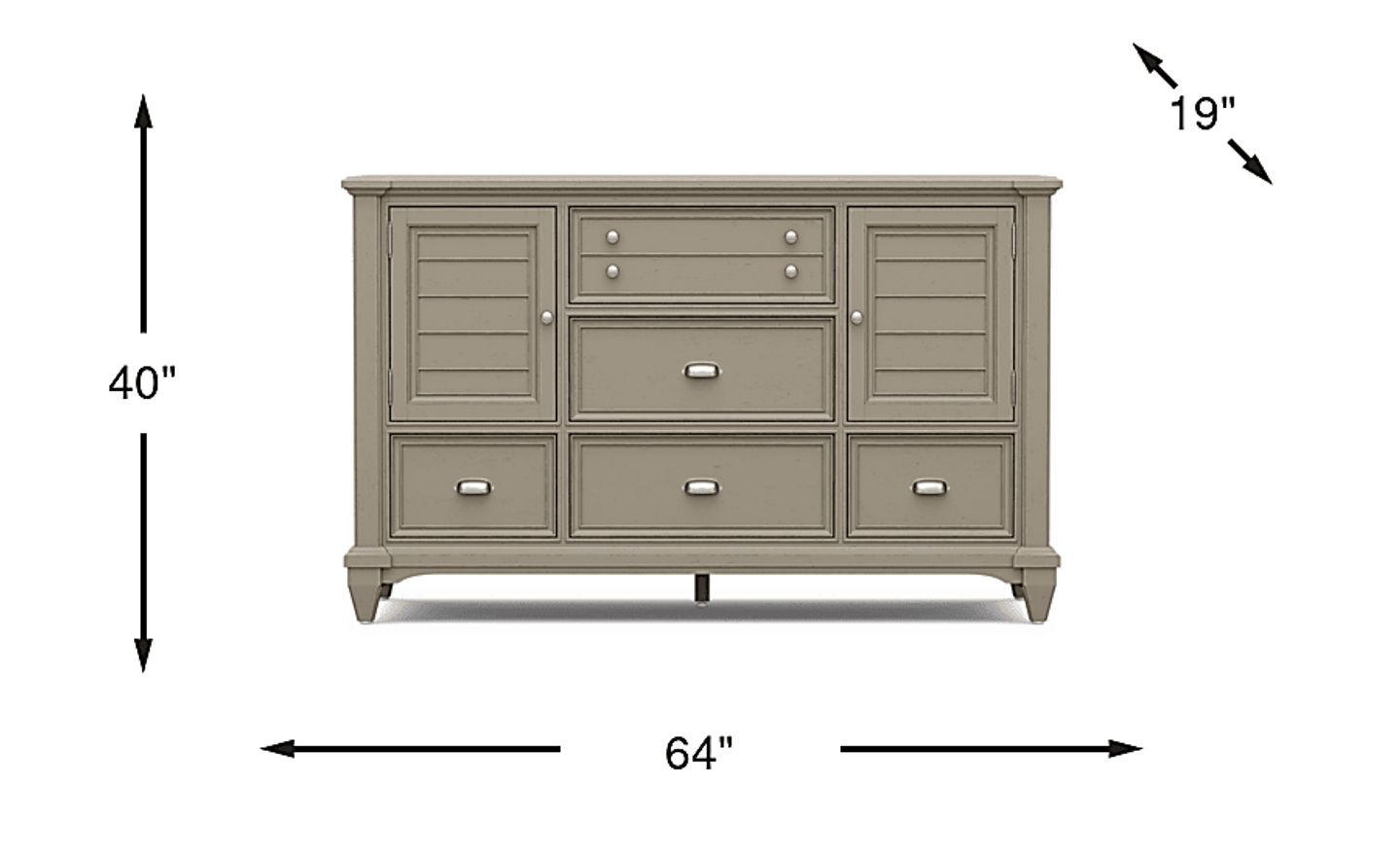 With dimensions of 64"w x 19"d x 40"h, this dresser is designed to maximize vertical and horizontal storage without an oversized footprint. The 19-inch depth is particularly beneficial for urban apartments or smaller suburban bedrooms, as it provides substantial storage capacity while leaving enough clearance for comfortable movement and easy access to the drawers and doors.