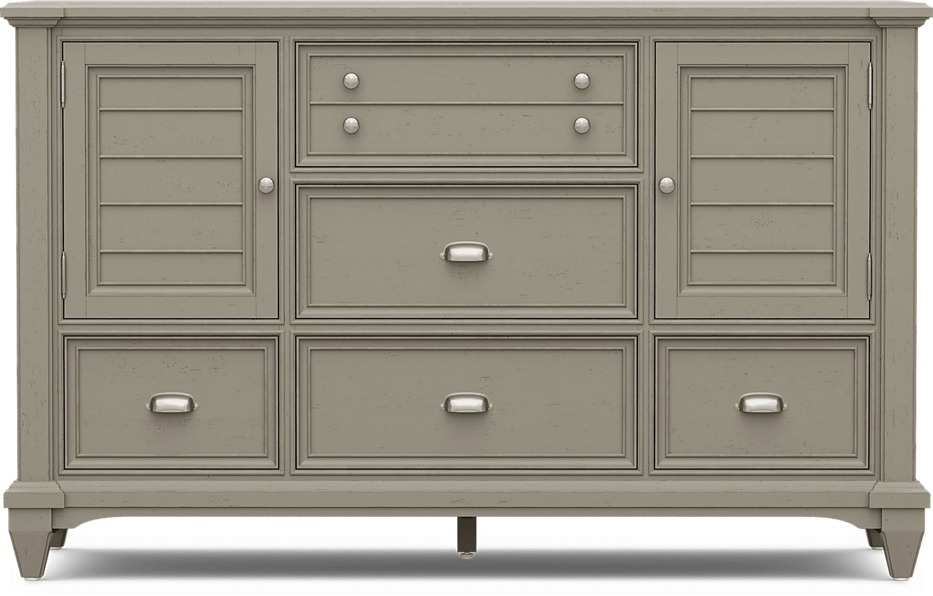 Yes, this dresser is an ideal choice for coastal or cottage-inspired interiors. The chic gray finish offers a sophisticated, weathered look that pairs beautifully with seaside palettes. Furthermore, the shutter-style bead moulding on the doors evokes a relaxed, airy vibe characteristic of coastal living, while the brushed nickel hardware provides a clean, modern touch.