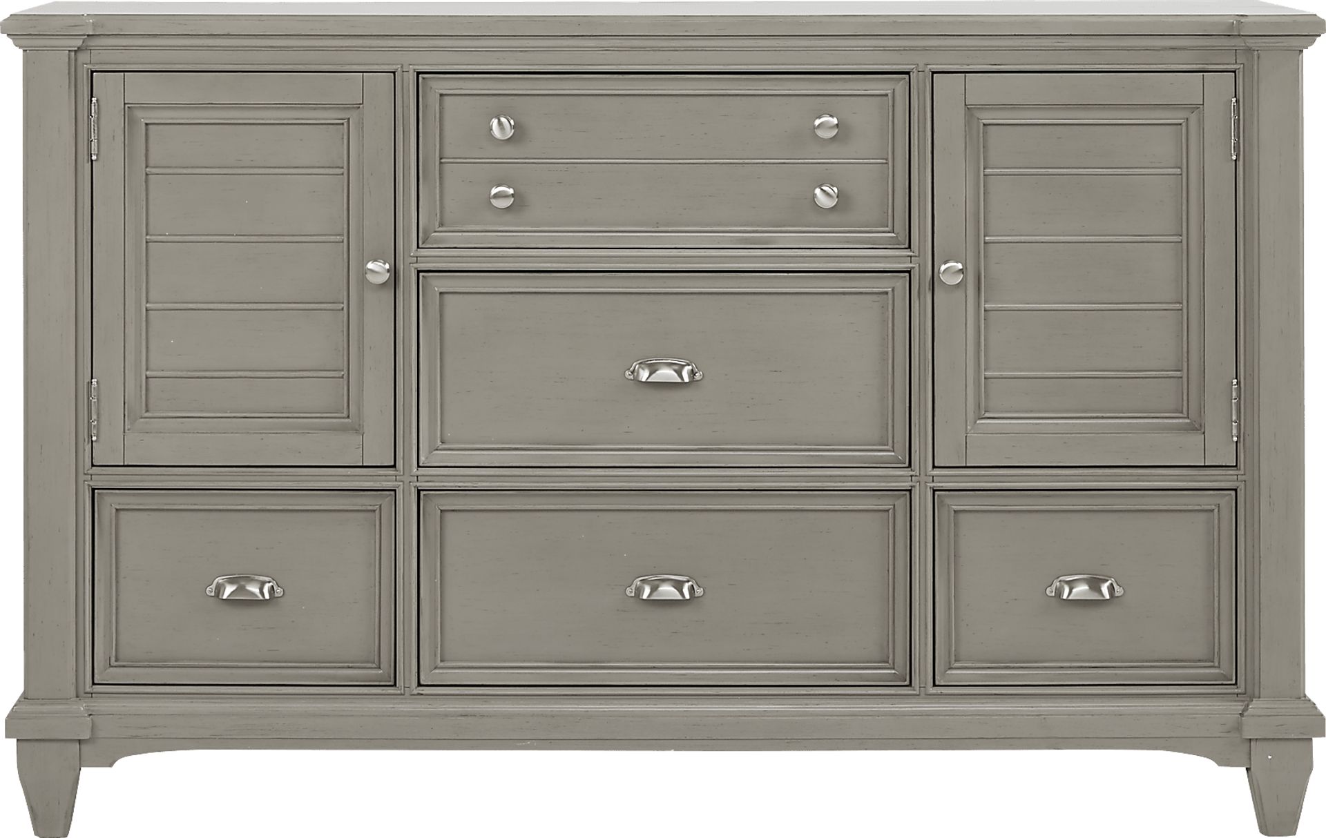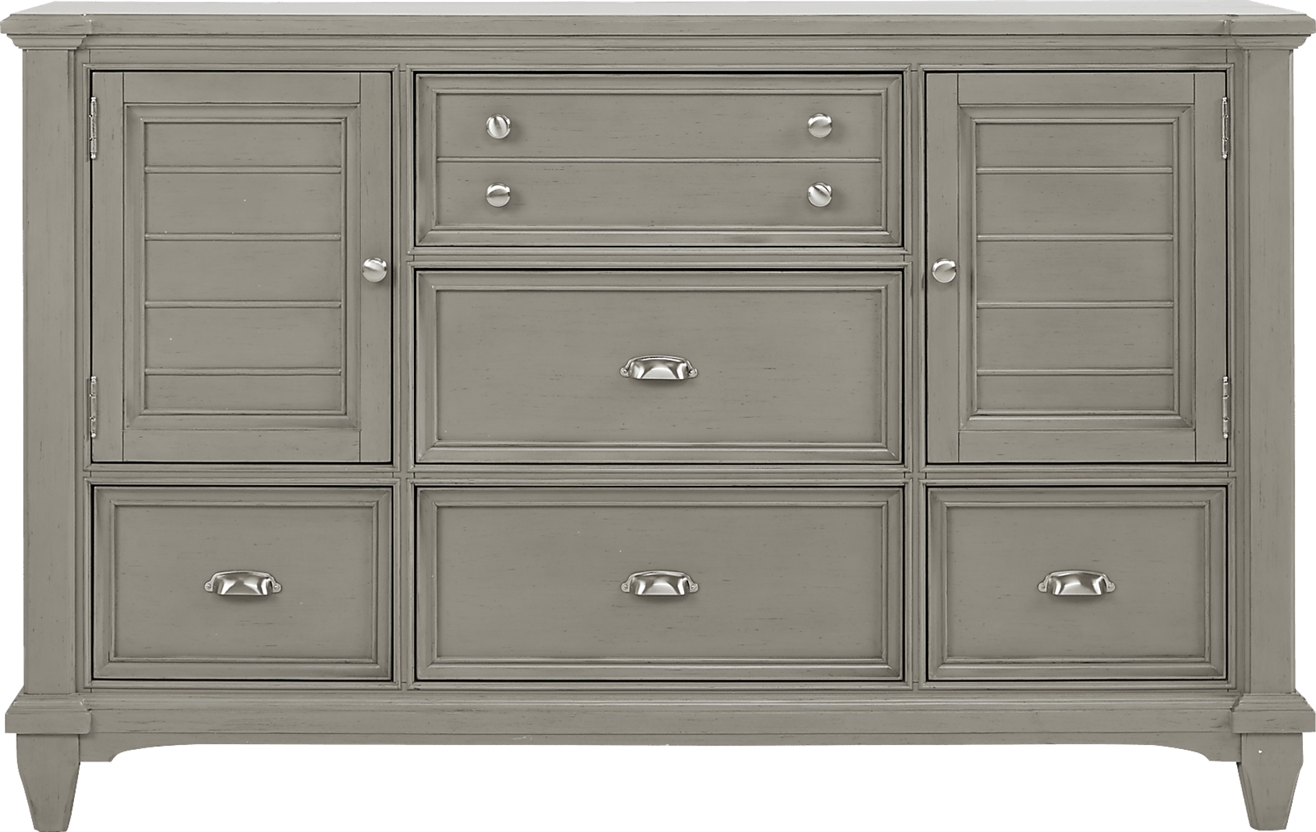 Simple yet tasteful cottage styling is the hallmark of the Hilton Head dresser. Boasting a chic gray finish, this piece has five spacious drawers for storage (the drawer on the top is one drawer made to look like two). All drawers are crafted using English and French dovetail construction for strength and stability. Each door has bead moulding for a shutter look and opens to reveal an adjustable shelf for folded clothing. Brushed nickel finished hardware adds the final touch. This is a timeless dresser that will always be in style.