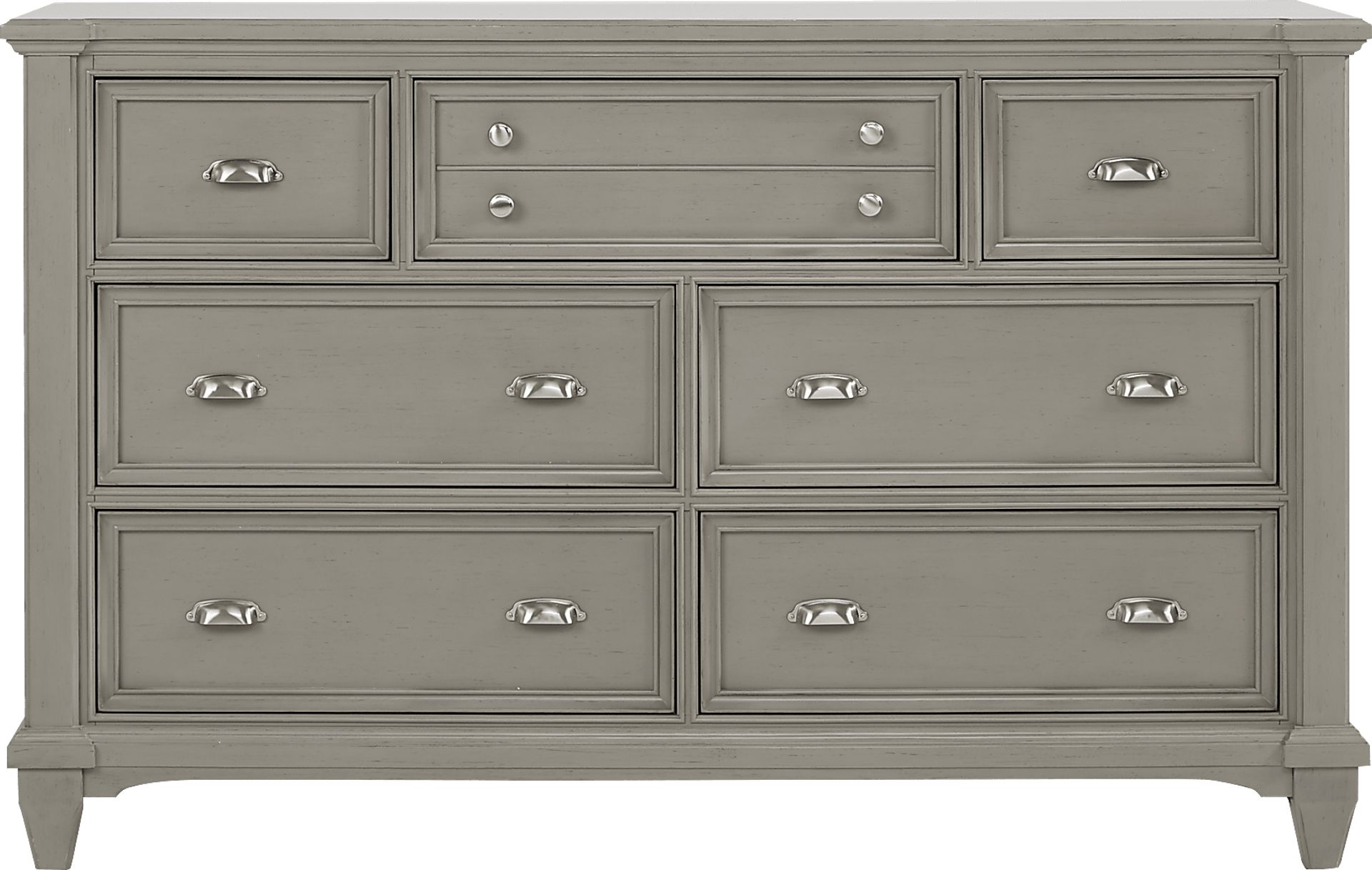 Simple yet tasteful cottage styling is the hallmark of the Hilton Head dresser. Boasting a chic gray finish, this piece has seven spacious drawers for storage (the center drawer on the top row is one drawer made to look like two). All drawers are crafted using English and French dovetail construction for strength and stability. Brushed nickel finished hardware adds the final touch. This is a timeless dresser that will always be in style.