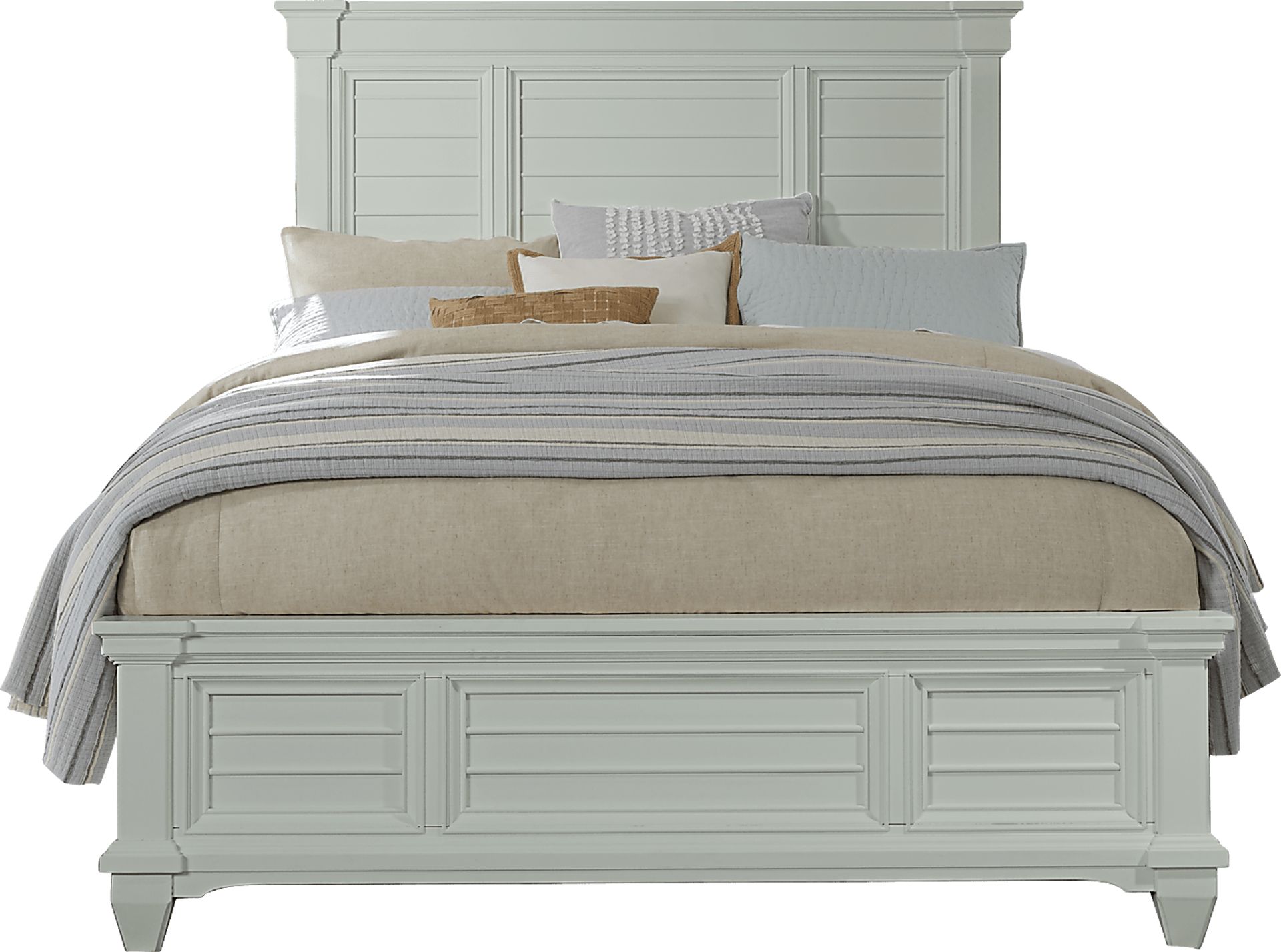 Relax at the end of the day in the serenity of the stylish Hilton Head panel bed. This cottage style bed features a shutter look on the headboard and footboard created by bead moulding. The mint green finish gives the bed a fresh casual vibe. Reversible rails allow the height of the mattress to be raised or lowered. Mattress and foundation (if required) sold separately. Bed shown is queen size.