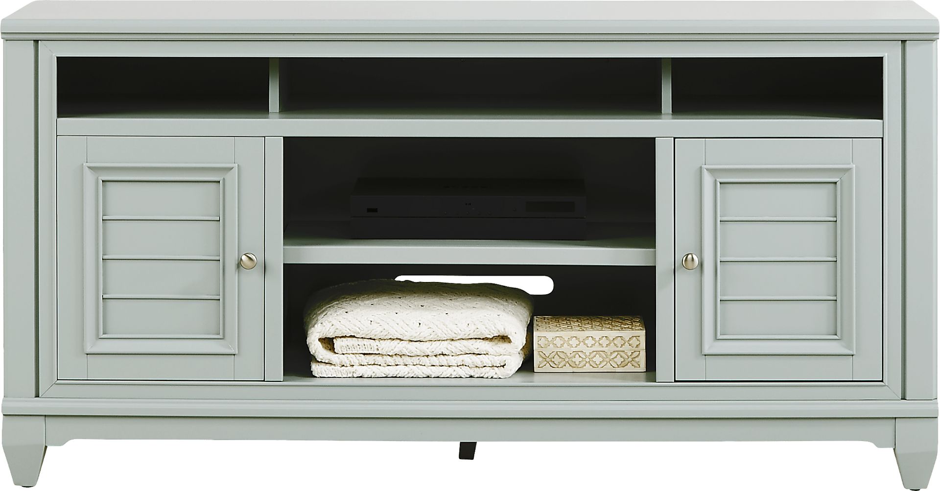 Center your home entertainment space with the coastal style of the Hilton Head console. This piece is perfect for your TV, sound system and any additional media devices you want to keep organized. This console comes in a beautiful mint green color and features five storage cubbies great for cable boxes or Blu-ray players along with two cabinets to keep additional cables or discs safely tucked away.