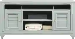 Center your home entertainment space with the coastal style of the Hilton Head console. This piece is perfect for your TV, sound system and any additional media devices you want to keep organized. This console comes in a beautiful mint-green color and features five storage cubbies great for cable boxes or Blu-ray players along with two cabinets to keep additional cables or discs safely tucked away.