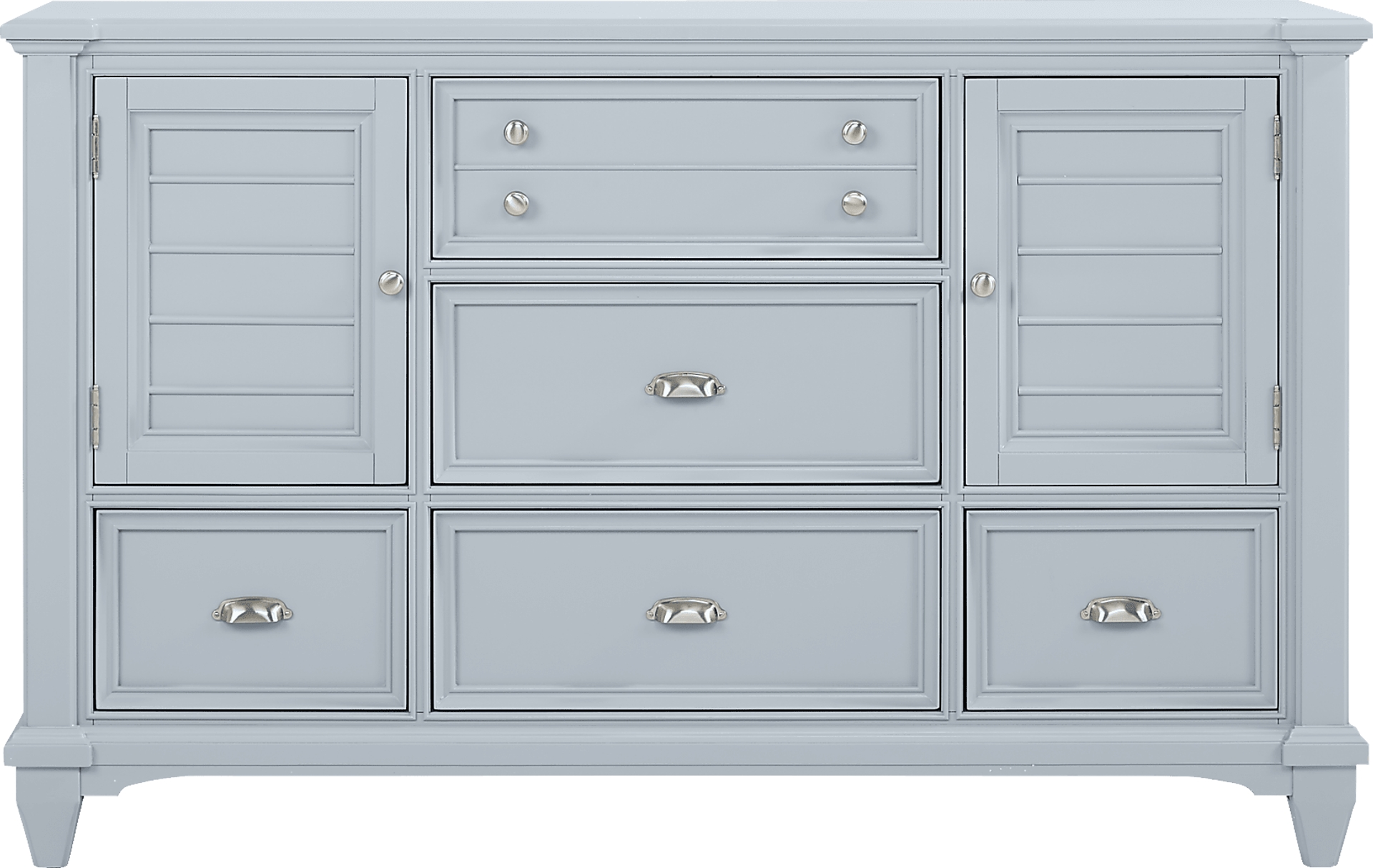 Simple yet tasteful cottage styling is the hallmark of the Hilton Head dresser. Boasting a fresh mint green finish, this piece has five spacious drawers for storage (the drawer on the top is one drawer made to look like two). All drawers are crafted using English and French dovetail construction for strength and stability. Each door has bead moulding for a shutter look and opens to reveal an adjustable shelf for folded clothing. Brushed nickel finished hardware adds the final touch. This is a timeless dresser that will always be in style.
