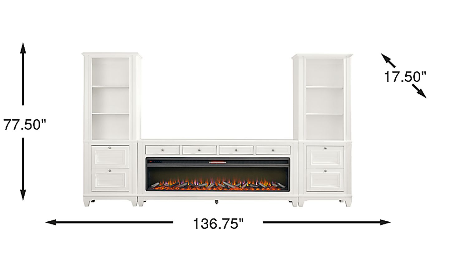 With a total width of 136.75 inches (over 11 feet), this 4-piece system is a substantial architectural element. It is best suited for large, open-concept living rooms or spacious suburban homes where it can serve as the primary focal point. While the "Hilton Head" white finish and silver hardware offer a bright, coastal contemporary aesthetic that complements beachside interiors, the sheer scale of the unit requires a significant wall to avoid crowding a smaller room.