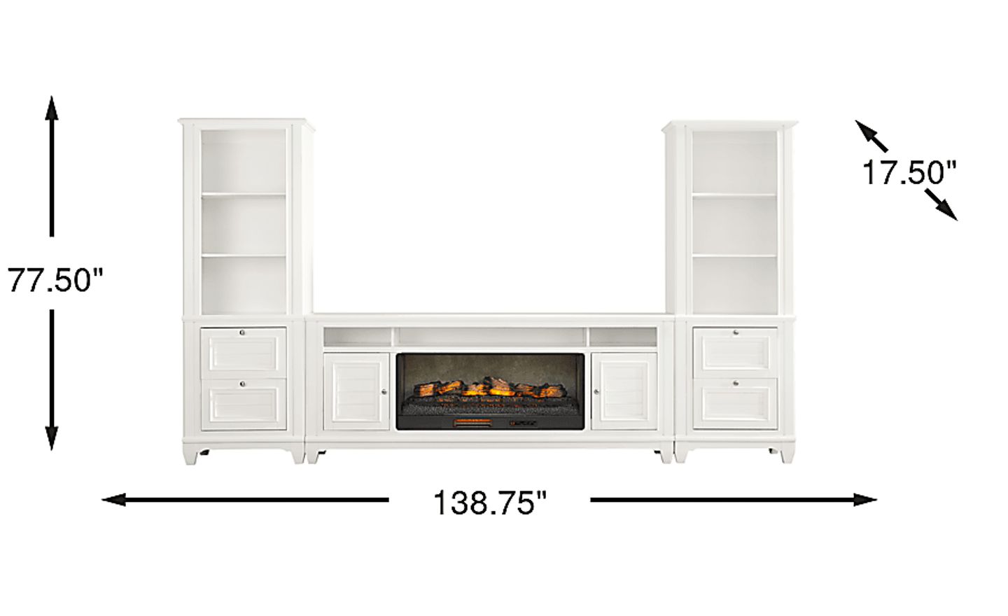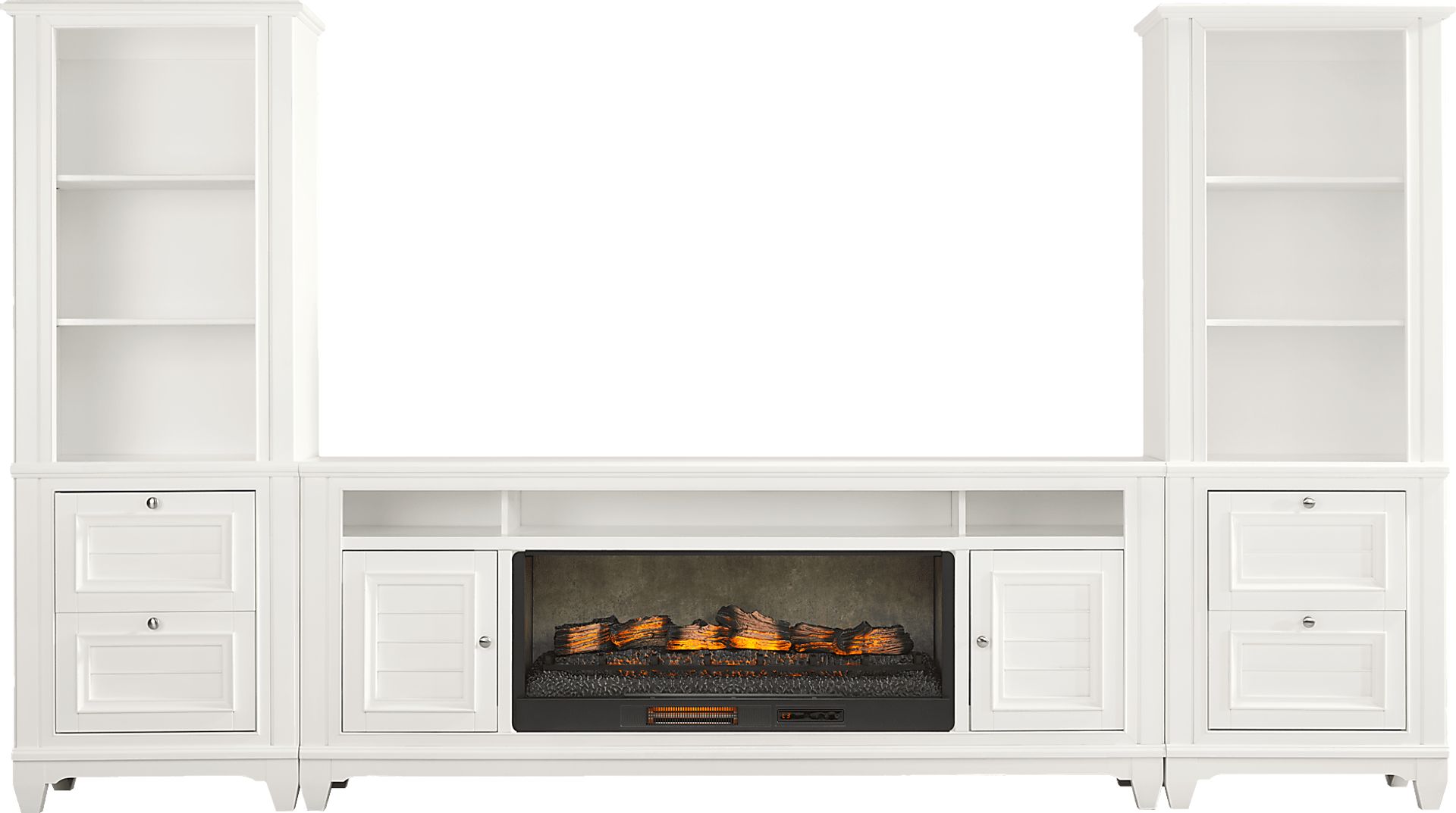 Stylish and casual, the Hilton Head collection is perfect for your TV, sound system and any additional media devices you want to keep organized. Contemporary in style, this wall unit comes in a beautiful white finish and showcases slat styled doors and drawers with silver metal knobs. Its 82-inch console features three storage cubbies and two cabinets that's great for storing your entertainment essentials. A storage pier at each end provides two additional drawers per side as well as three shelves ideal for books, family photos and more. The included electric fireplace features innovative flame effects on bricks and logs for added depth and 3D realism. A convenient remote control allows you to adjust the flame and glow levels for a cozy ambience year-round.