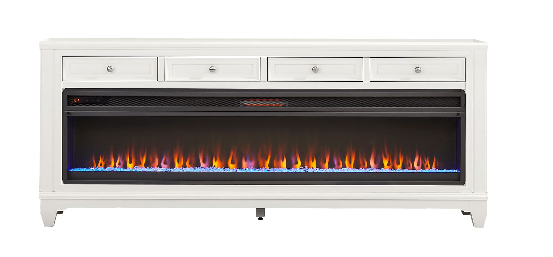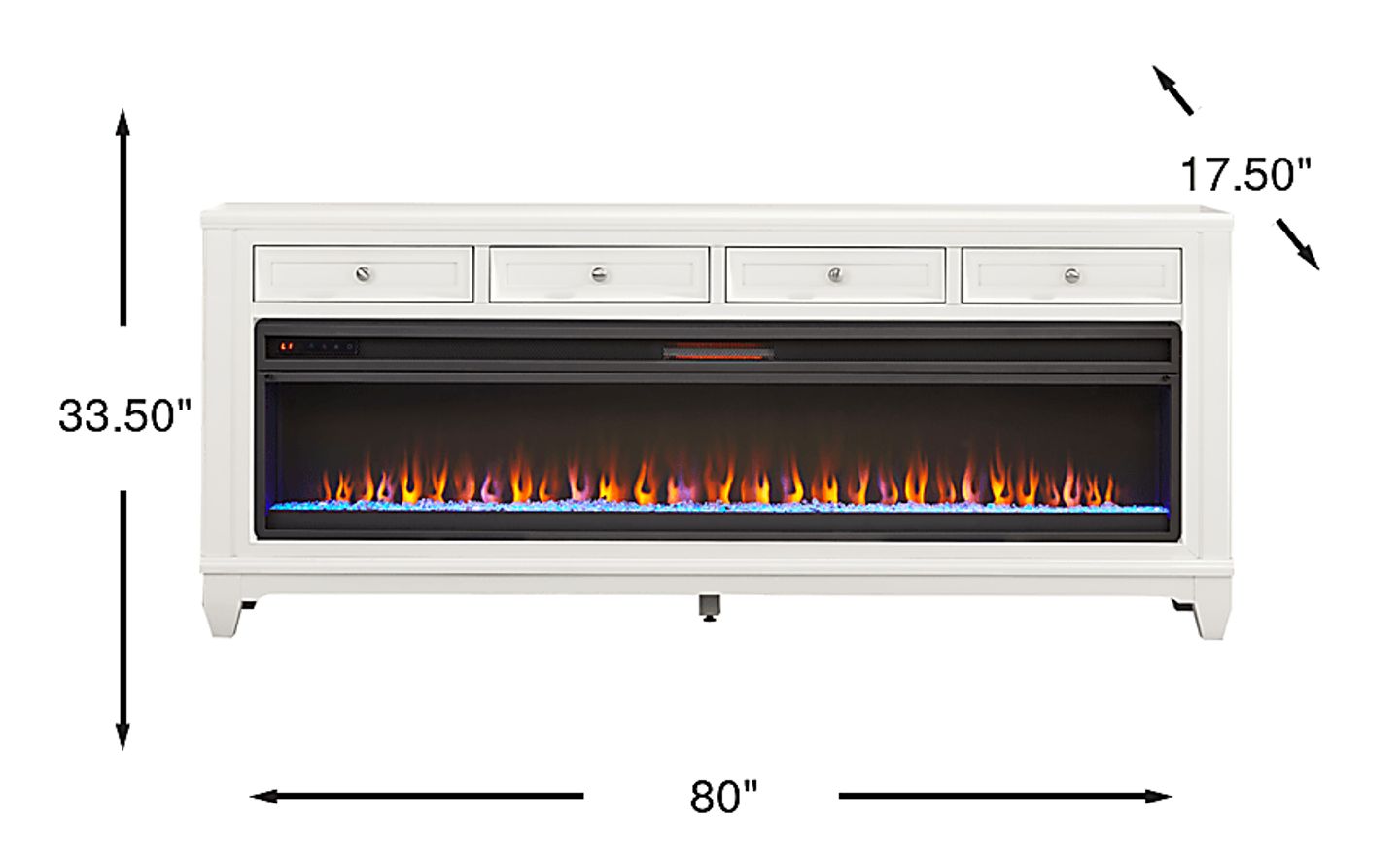 Stylish and casual, the Hilton Head collection is perfect for your TV, sound system and any additional media devices you want to keep organized. Contemporary in style, this console comes in a beautiful white finish and features four drawers that's great for storing your entertainment essentials. The energy-saving LED firebox provides remote-controlled heat and ambient lighting with four color-changing options, creating a warm and cozy atmosphere at the touch of a button. Silver metal knobs complete the look with an elegant touch.