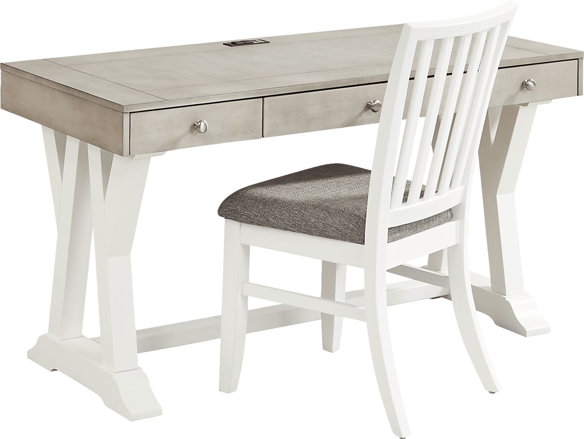 With refreshing hues and airy silhouettes with the laidback vibes of a beachside retreat, the Hilton Head desk and chair brightens your space with its clean lines and soothing ambiance. Contemporary in style, this sleek collection is crafted with birch veneers. The desktop is finished in a soft gray and features three drawers to store your office essentials while two electrical outlets with two USB ports bring convenient charging to your devices. The contrasting white trestle base adds a unique appearance with an intricate crossed design. The coordinating chair includes a comfortable seat cushion upholstered in gray fabric and showcases a classic slat back design for a final touch.