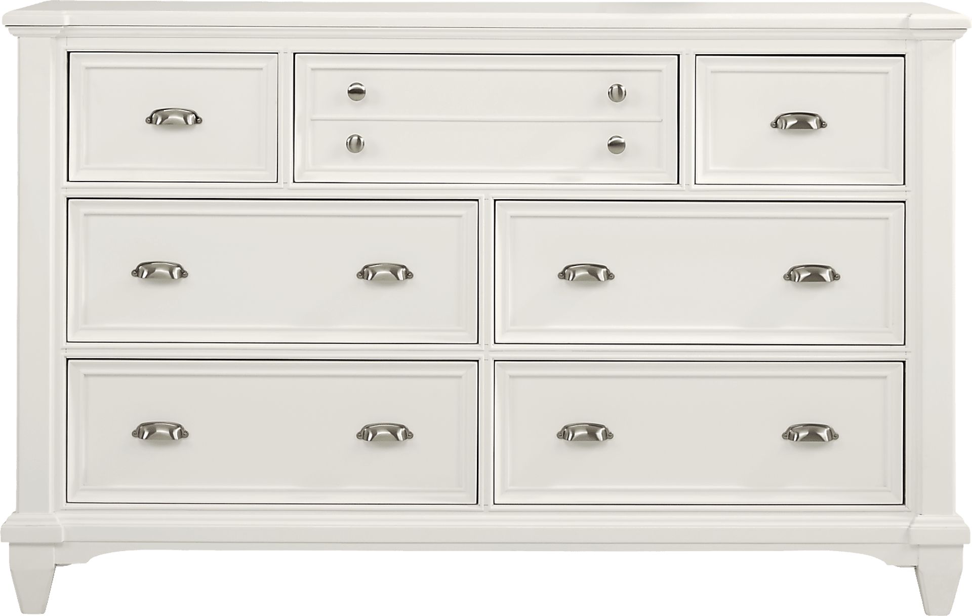 Simple yet tasteful cottage styling is the hallmark of the Hilton Head dresser. Boasting a fresh white finish, this piece has seven spacious drawers for storage (the center drawer on the top row is one drawer made to look like two). All drawers are crafted using English and French dovetail construction for strength and stability. Brushed nickel finished hardware adds the final touch. This is a timeless dresser that will always be in style.