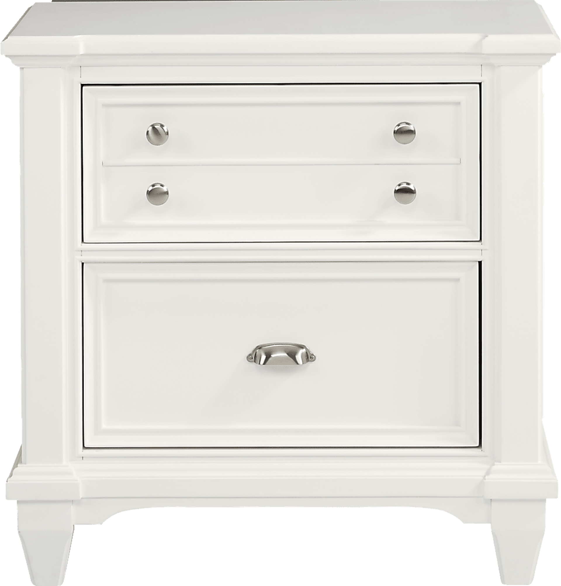 The Hilton Head nightstand makes a charming bedside companion with modern connectivity. Two USB ports and two power outlets, located behind the upper back of the nightstand, keep electronic devices charged. Two deep drawers keep your necessities close at hand (the top drawer is crafted to look like two drawers but is one spacious drawer). Each drawer is made using English and French dovetail construction for strength and stability. Crafted with a fresh white finish, this lovely piece is enhanced with brushed nickel hardware.