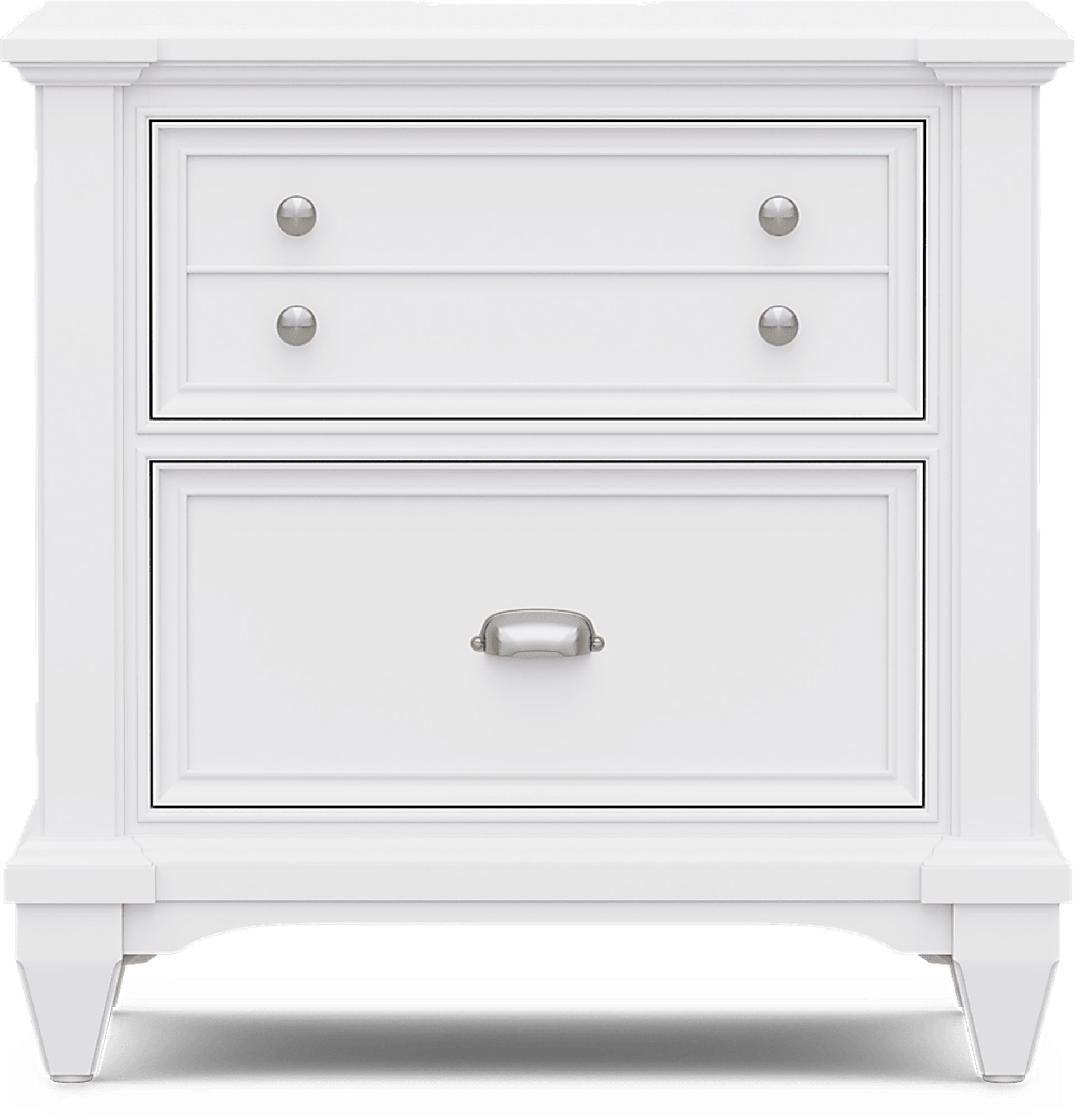 The Hilton Head nightstand makes a charming bedside companion with modern connectivity. Two USB ports and two power outlets, located behind the upper back of the nightstand, keep electronic devices charged. Two deep drawers keep your necessities close at hand (the top drawer is crafted to look like two drawers but is one spacious drawer). Each drawer is made using English and French dovetail construction for strength and stability. Crafted with a fresh white finish, this lovely piece is enhanced with brushed nickel hardware.