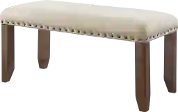 Give your dining room a hint of rustic charm with the Hinio bench. Its comfy seat is upholstered in a charming cream linen and accented by metal nail heads. Smokey walnut finished legs featuring distress marks give this chair a weathered and cozy look. Customer assembly required.