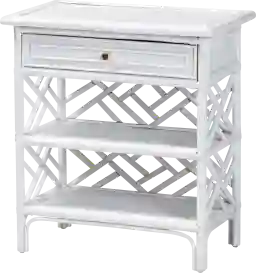 Outfit your bedroom with the efficiency and exotic poise of the Hogpoly white nightstand. This bohemian piece is handcrafted from sustainably sourced natural rattan. The drawer and two open shelves offer space to organize all your bedside essentials while reserving the tabletop for nightly use. The Hogpoly will arrive fully assembled and features a classic design along its frame for vibrant geometric charm. Finished with a tapered metal drawer knob, the Hogpoly is an outstanding bedroom complement. Rattan is a product of nature and may have variations in areas such as, but not limited to, color, pattern, grain and texture. The hair-like strands of rattan/rattan-fiber are common due to the nature of the material.