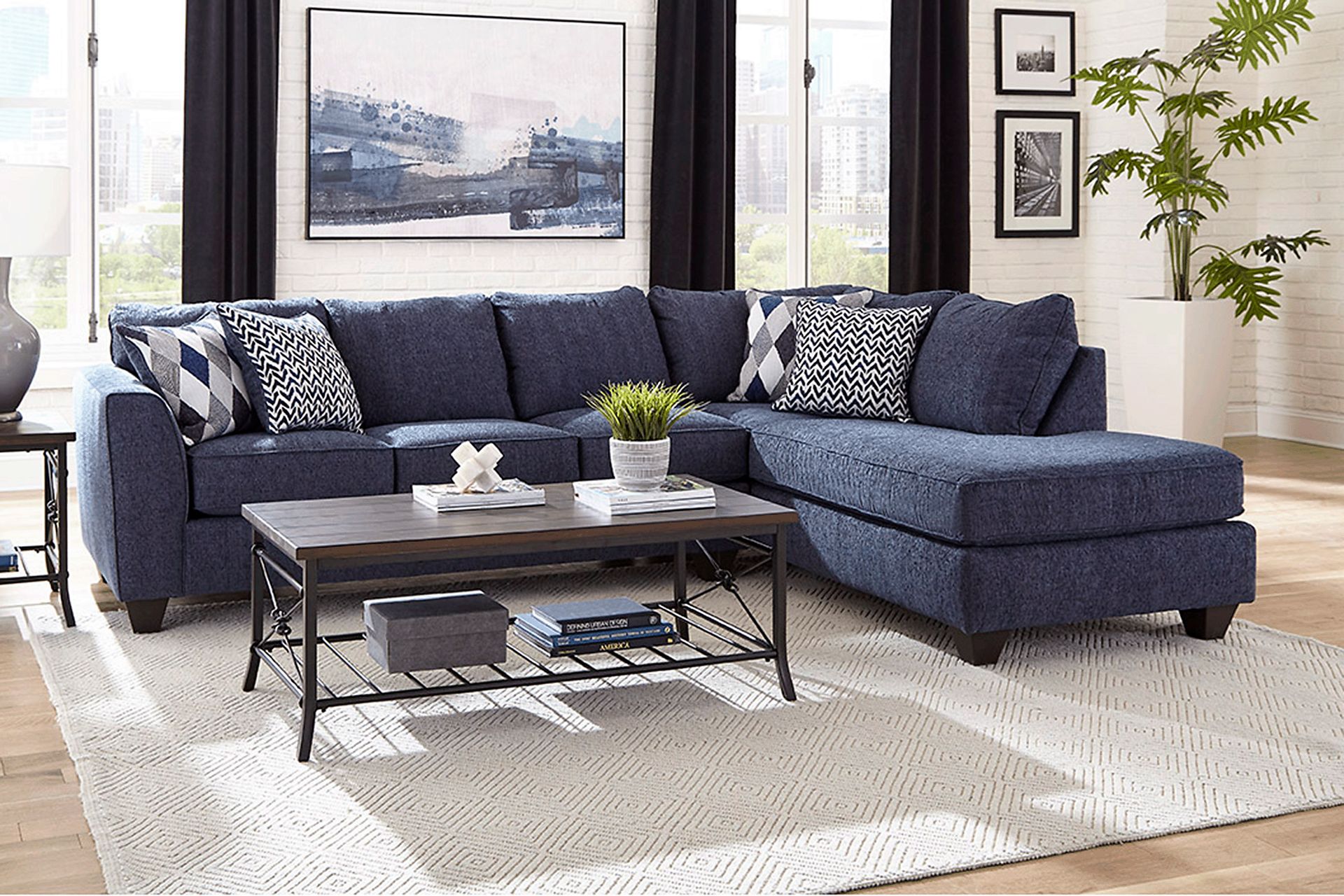 Make every day a holiday with the transitional style of the Holiday Grove blue sectional. Made of texture fabric with three seat cushions for added flexibility and longevity on the sofa and a single cushion on the chaise. Stylish padded flare arms give it comfort and a hint of old world charm that is further embellished with wood leg accents in a warm brown finish. Patterned accent pillows included. Upholstery: 100% Polyester. Cleaning Instructions: Use water based cleaning agents or foam.