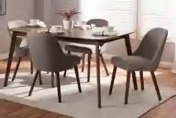 The gentle curves and minimalist style of the Hollilynn five-piece dining set make it easy to coordinate in casual and formal settings. The set's mid-century modern-inspired design is apparent in the curved, slightly arched chairbacks. The Hollilynn is built to last with solid rubberwood construction. The chair features chic, light gray fabric upholstery and a comfortable, foam-padded seat. The table of the Hollilynn dining set has a rounded edge design, encouraging a casual, retro vibe. The table and chair legs feature a warm, walnut-finish, with shapely angled legs. This dining set will add a touch of modern flair to your dining room, breakfast nook, or rec room. Customer assembly is required.