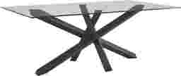 Add a signature flair to any occasion whenever the Hollybrooke dining room's poised angles take center stage. Dining around this contemporary 44" table means a front-row view of its bold crisscrossed black legs through the beveled glass top. Four midnight blue upholstered Sambuca dining chairs with soft curved edges and metal legs add contemporary appeal.