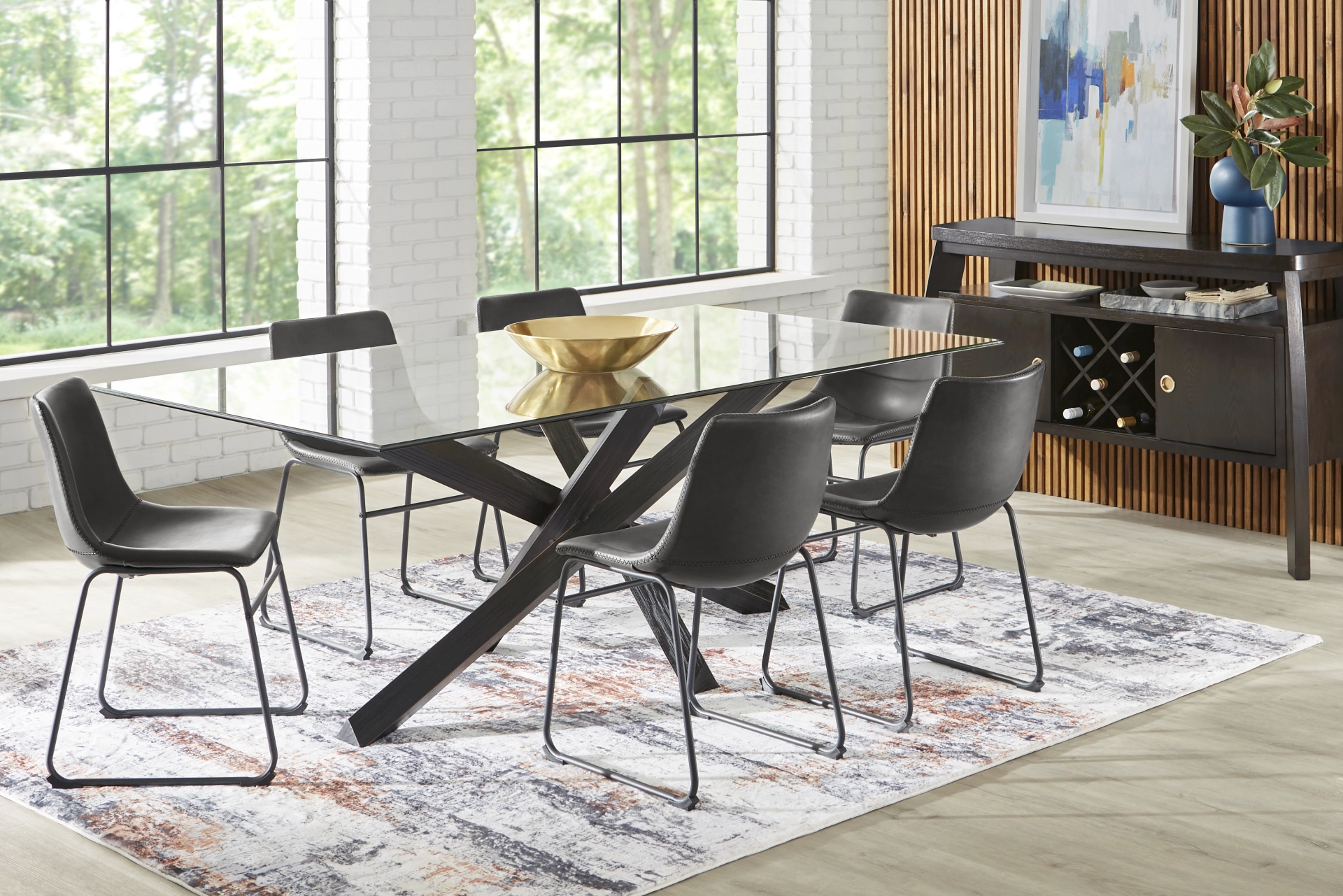 Add a signature flair to any occasion whenever the Hollybrooke dining room's poised angles take center stage. Dining around this contemporary table means a front-row view of its bold crisscrossed black legs through the beveled glass top. Six gray Barcroft dining chairs with curved edges and metal bases add modern, low-maintenance appeal.