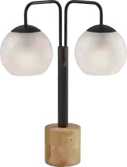 Introducing the Horatio Way Black Lamp, a sleek and sophisticated addition to your home decor. With its black finish and unique design, this lamp effortlessly combines style with functionality. Featuring two globe-shaped shades, glossy on the outside and frosted on the inside, it creates a soft, ambient glow that adds warmth to any space. Standing at 23.5 inches tall, it is supported by a sturdy travertine stone base, providing stability and visual contrast. Partial assembly may be required.