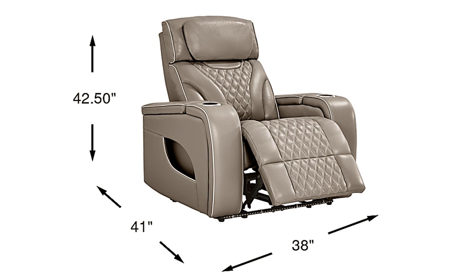 The luxuriously tailored look and upscale modern amenities of the Horizon Ridge recliner offer a relaxation experience that can only be described as "out of this world". Beige top grain leather where the body touches welcomes users with sumptuous comfort, while the stunning channeled and quilted diamond details of the perforated seat back keeps extended seating sessions comfortable and cool. The sleek track arms of this transitional piece are for much more than show, with cupholders and storage on each arm. Ellipse storage on the outside of each arm features a touch of ambient lighting, perfect for grabbing anything you need out of the pocket while maintaining movie-night atmosphere. Triple-power reclining offers adjustable footrest, lumbar, and headrest via a patented zero gravity mechanism, as well as therapeutic heat and air massage functions. A hand wand offers easy control and a USB charging port. Upholstery: top grain leather where the body touches, vinyl sides and back.