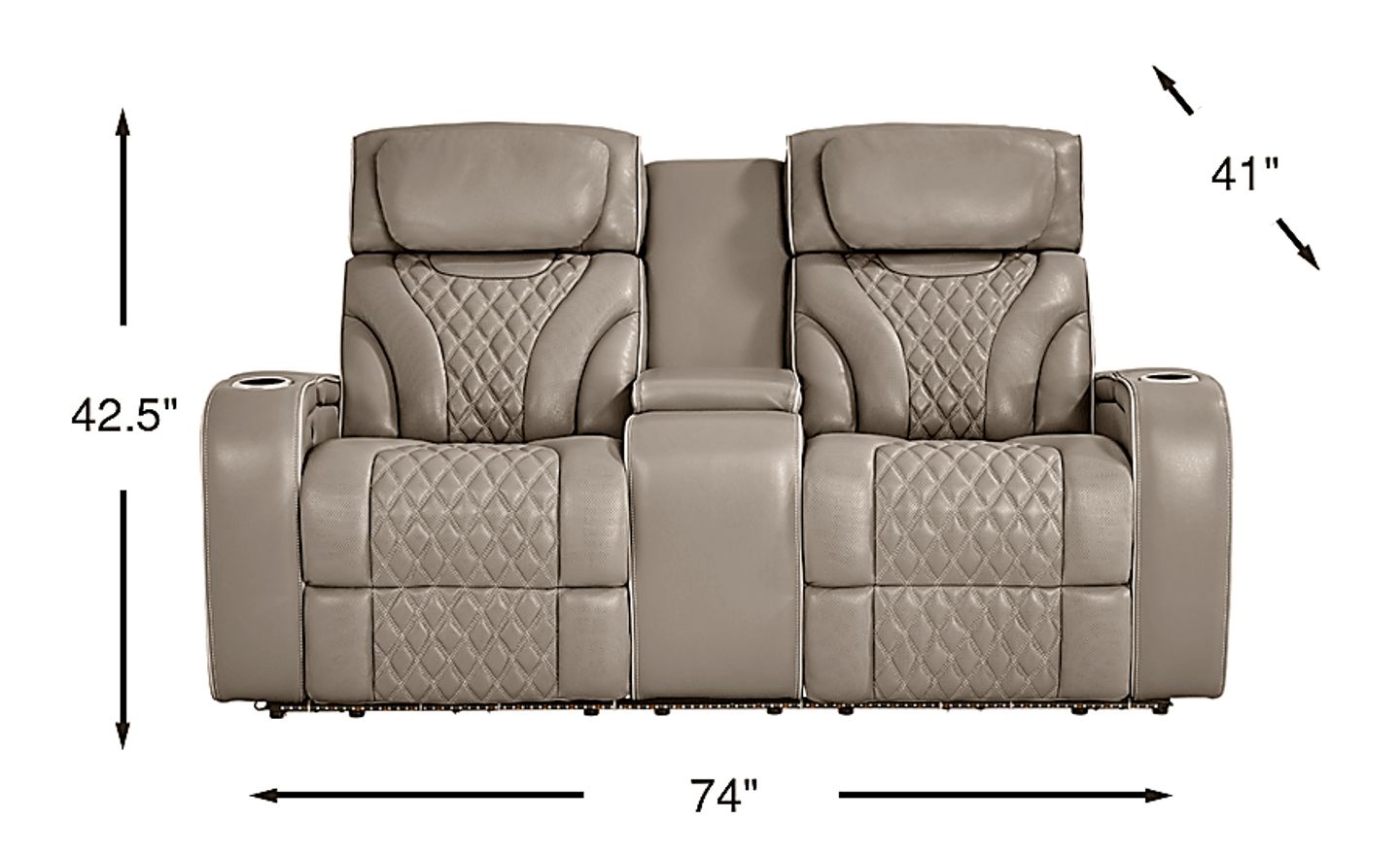 This piece is expertly engineered for media room environments. It features a center console with storage, dual cupholders, and specialized "ellipse" storage pockets built into the track arms. The arms also include ambient lighting, allowing you to easily locate your remote or snacks without disrupting the movie-night atmosphere. At 74 inches wide, it provides full-scale theater amenities while remaining compact enough to fit comfortably in smaller apartments or dedicated basement media rooms.