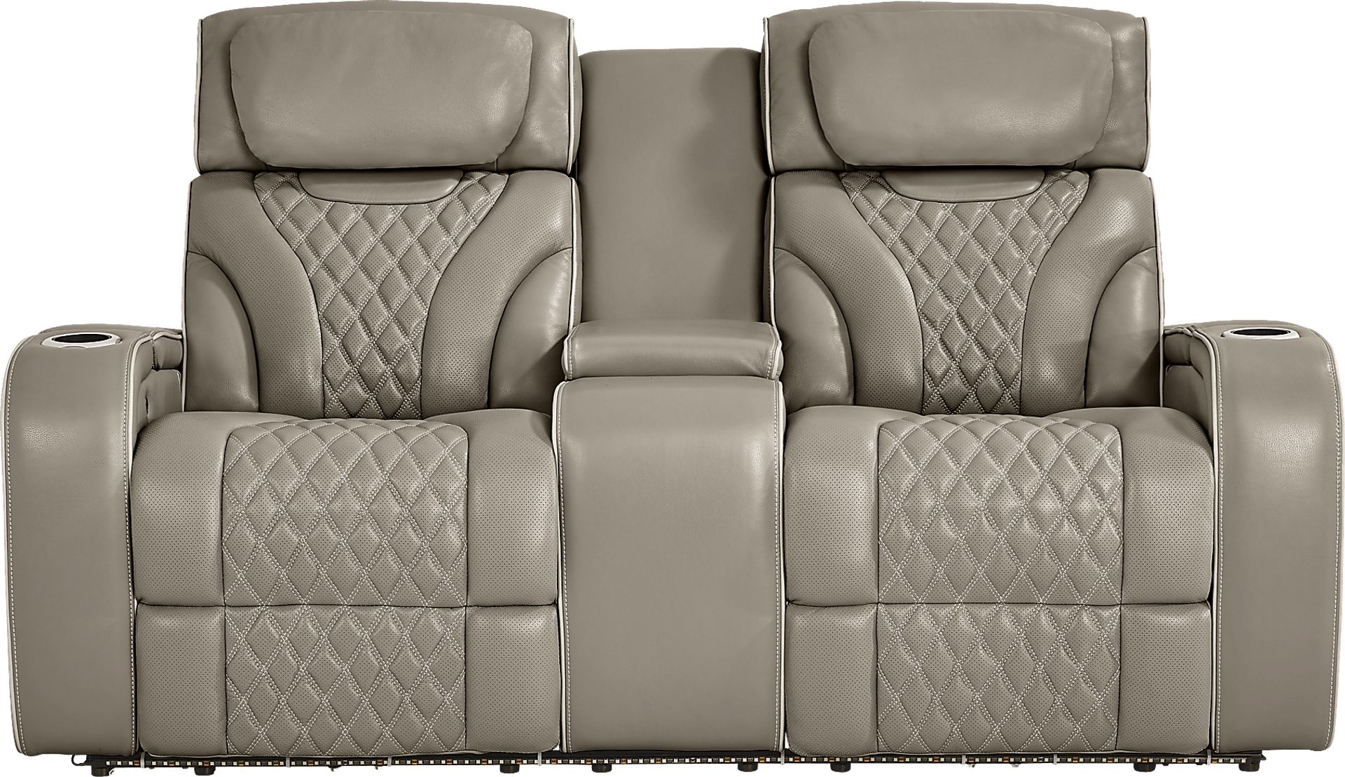 The luxuriously tailored look and upscale modern amenities of the Horizon Ridge loveseat offer a relaxation experience that can only be described as "out of this world". Beige top grain leather where the body touches welcomes users with sumptuous comfort, while the stunning channeled and quilted diamond details of the perforated seat back keeps extended seating sessions comfortable and cool. The sleek track arms of this transitional piece are for much more than show, with cupholders and storage on each arm. Ellipse storage on the outside of each arm features a touch of ambient lighting, perfect for grabbing anything you need out of the pocket while maintaining movie-night atmosphere. This loveseat is also equipped with a center console, with extra storage inside. Triple-power reclining offers adjustable footrest, lumbar, and headrest via a patented zero gravity mechanism, as well as therapeutic heat and air massage functions. A hand wand offers easy control and a USB charging port. Upholstery: top grain leather where the body touches, vinyl sides and back.