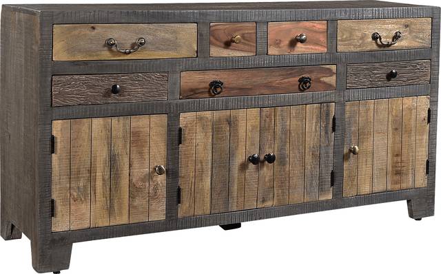 Bring the beauty of nature directly into your home with the natural finished Horsemint sideboard. The surrounding frame is built from solid Mango in a stone gray finish. Each of the seven drawers showcase a natural finish on a variety of wood species. You will find Sheesham, Acacia, Mango and Sheesham bark each sporting an eclectic mix of hardware. The four doors open to large storage compartments with a removable shelf. Store your linens, dinnerware, games, memorabilia and more in this stunning tribute to the nature's natural beauty. Customer assembly is required.