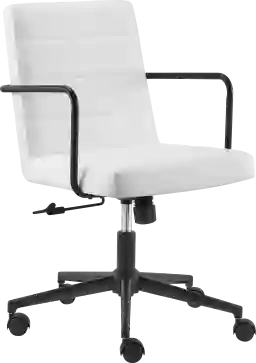 The Houkom white office chair features a soft leatherette upholstered seat and back, matte black powder coated steel armrests and base with nylon casters. It comes with a tilt mechanism that locks it in an upright position. Customer assembly is required.