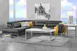 Uptown flair brings sophisticated style and conversation home with the luxurious Hudson Heights sectional. From the handsome tuxedo arms to the shiny chrome legs, this piece has a top to bottom contemporary appearance with a left arm facing chaise alongside a right arm facing sofa. The seats feature adjustable ratchet-style headrests and supportive lumbar cushions that make relaxing an easy invitation. Built in storage compartments are the perfect place to keep remotes, electronic cords and more of your favorite things organized and close at hand. The black color of the soft, sleek fabric is complimented by the sectional's gorgeous, tufted details. Upholstery: 85% Polyester, 15% Polyurethane.