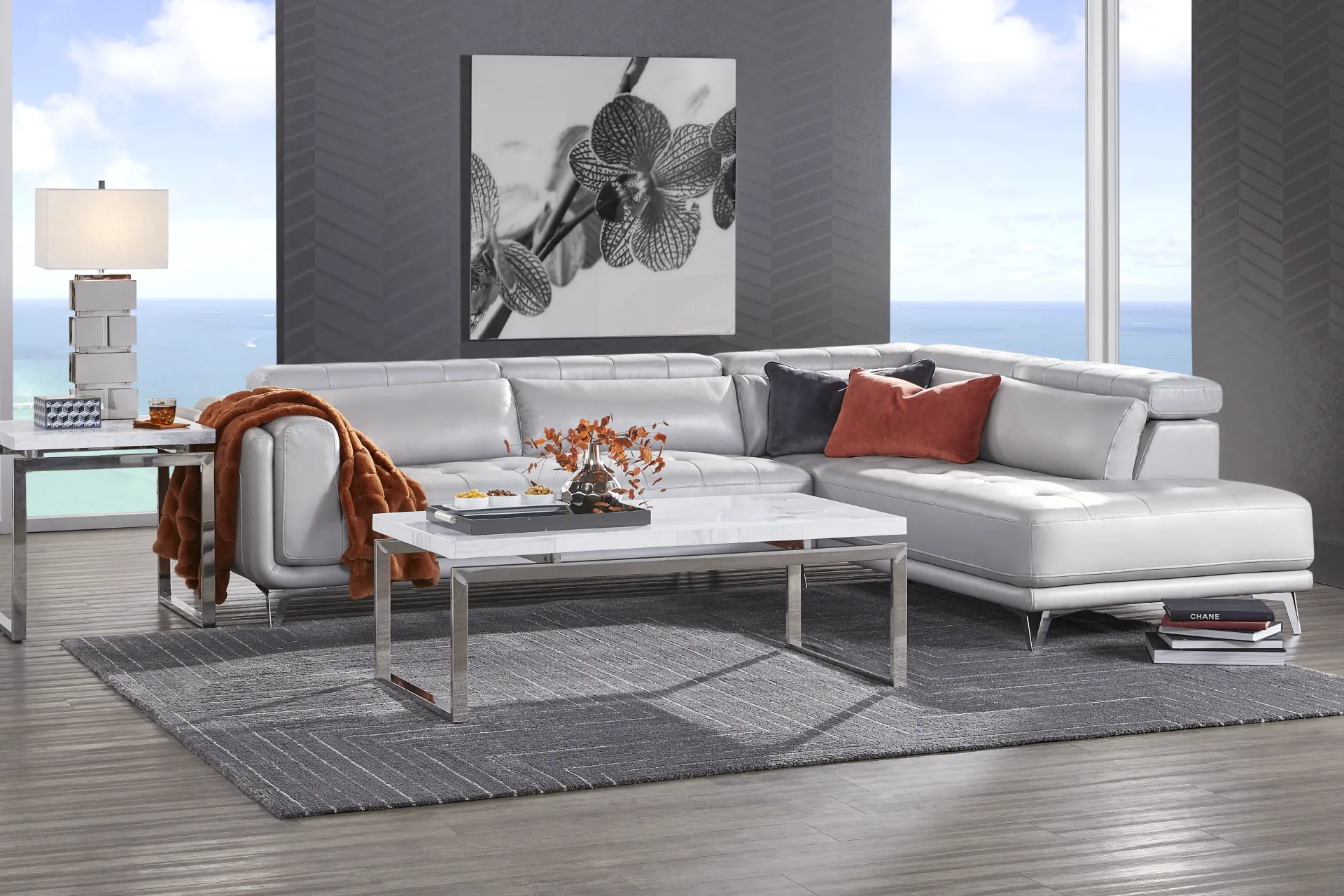 Uptown flair brings sophisticated style and conversation home with the luxurious Hudson Heights sectional. From the handsome tuxedo arms to the shiny chrome legs, this piece has a top to bottom contemporary appearance with a right arm facing chaise alongside a left arm facing sofa. The seats feature adjustable ratchet-style headrests and supportive lumbar cushions that make relaxing an easy invitation. Built in storage compartments are the perfect place to keep remotes, electronic cords and more of your favorite things organized and close at hand. The platinum color of the soft, sleek fabric is complimented by the sectional's gorgeous, tufted details. Upholstery: 85% Polyester, 15% Polyurethane.
