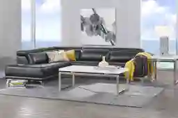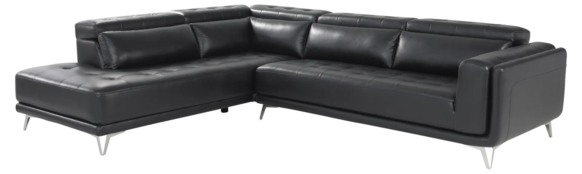 Uptown flair brings sophisticated style and conversation home with the luxurious Hudson Heights sectional. From the handsome tuxedo arms to the shiny chrome legs, this piece has a top to bottom contemporary appearance with a right arm facing chaise alongside a left arm facing sofa. The seats feature adjustable ratchet-style headrests and supportive lumbar cushions that make relaxing an easy invitation. Built in storage compartments are the perfect place to keep remotes, electronic cords and more of your favorite things organized and close at hand. The platinum color of the soft, sleek fabric is complimented by the sectional's gorgeous, tufted details. Upholstery: 85% Polyester, 15% Polyurethane.