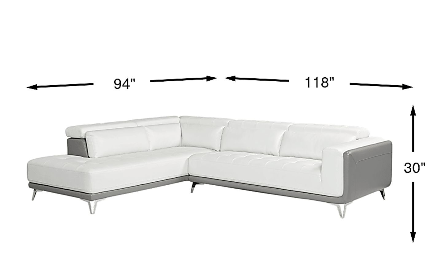 Offering stylish comfort for everyday lounging and spacious seating for entertaining, the Hudson Heights sectional will be an impressive addition to any contemporary home. Large enough to seat six people, the sectional is upholstered in soft, breathable fabric in a beautiful two-tone white and gray combination. Ratchet style headrests allow each person to separately adjust each headrest to find the position that provides optimal comfort and individualized support. Back and seat cushions are attached. Tufted detailing and high European arm design add eye appeal while dual storage compartments offer a convenient place for blankets, remotes and more. Shaped chrome legs reinforce the chic, modern aesthetic. 85% Polyester, 15% Polyurethane