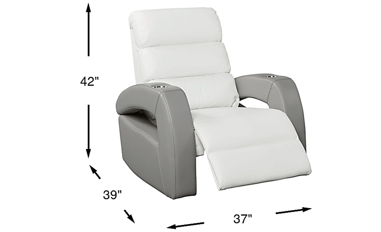 The Hudson Heights offers a modern twist on the traditional recliner. This version is sleekly designed with contemporary open arms featuring cupholders. One arm has a USB port built-in. Channeled detailing and soft, breathable fabric in a two-tone white and gray combination create a striking look and feel. The padover chaise footrest offers full leg support and can be raised and lowered with the simple touch of a button. 85% Polyester, 15% Polyurethane Seat depth 22, seat width 23