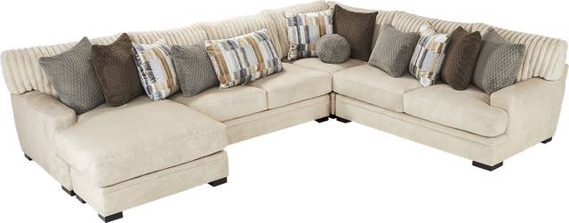 Modern uptown luxury meets traditional downhome comfort with the Hudson Street sectional from Cindy Crawford Home. Highlighted by soft knit upholstery, this transitional piece features wide, low-profile track arms that run from the left arm facing chaise sofa to the right arm facing loveseat. Vertical channeling on the lush back cushions supplies the look with an eye-popping detail while feather blend seat cushions and coordinating accent pillows provide even more plush, padded relaxation. The beige color of the sectional's downy fabric lends the grand silhouette an irresistible final touch. Upholstery:100% Polyester.