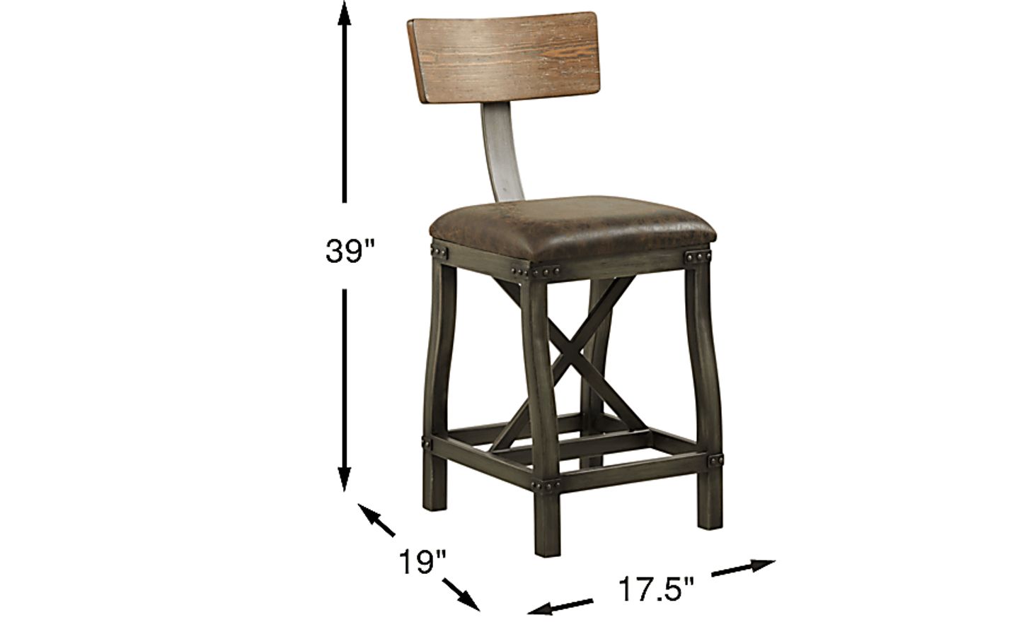 Wonderfully on-trend the Hunter Mill counter height stool boasts a curved wood back and a padded seat with a distressed leather look. Industrial-inspired metal legs and stretchers feature a dark gray brushed finish.