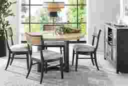 If you're craving an elegant dining space with room for your family, it's time to feast your eyes on the Hunter Springs collection. Brimming with a contemporary appeal, the table features a stunning round glass inlay. The base is crafted of hardwood solids in a black color while the round top showcases the natural hue of light oak veneers. The four coordinating side chairs have backs adorned with cane details and feature seats upholstered in a soft neutral tone fabric. The contemporary styling of each piece is complimentary to a vast range of accompanying décor styles.
