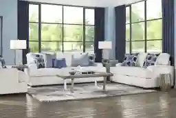 With a refreshingly bright and laid-back style, The Hutchinson living room enhances every moment of quality time spent with family & friends. This contemporary set features relaxed woven upholstery in a light cream color that dazzles. Details like welted seams and tapered block legs bring subtle visual appeal, while the low-profile track arms and reversible seat and back cushions offer functionality as well as style. Complementing and enhancing the airy look, three pairs of accent pillows add a splash of color. Upholstery: 100% Polyester. Cleaning Instructions: Use water based cleaning agents or foam. Small blue accent pillow not included.