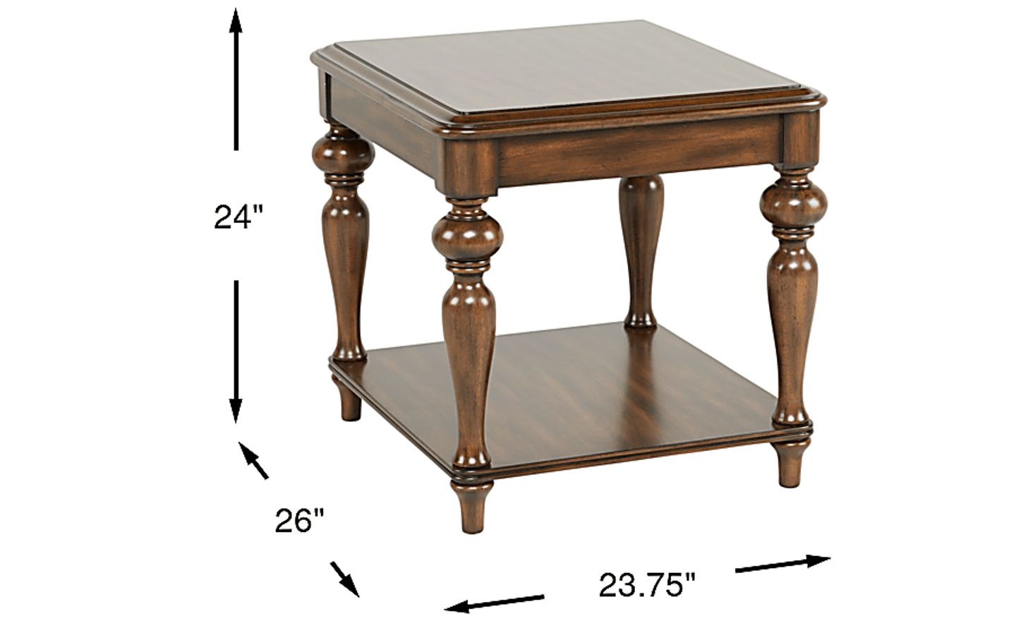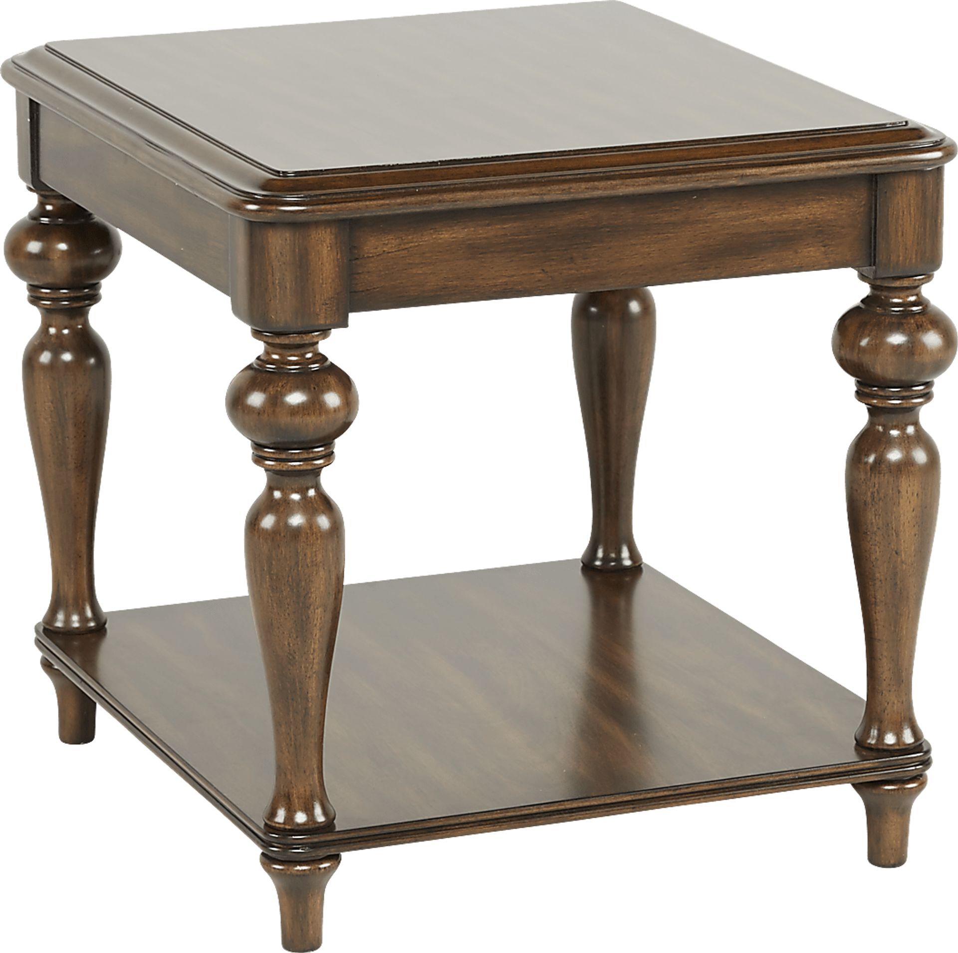 Classic and sophisticated, the Hutton end table's traditional style makes it a timeless choice. Crafted with Okume veneers in a warm brown finish, this table features elegant turned legs and a useful lower storage shelf.