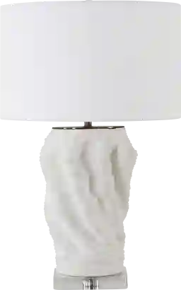 The Hyacinth Boulevard White Lamp creates a modern look with its organic, free flowing shape. Combining sculpture and functionality, this ceramic vase, featuring layers of organically shaped stacked rings, finished in a matte white glaze, accented with brass plated details and a thick crystal foot. The round drum shade is a crisp white linen fabric. Partial assembly may be required.